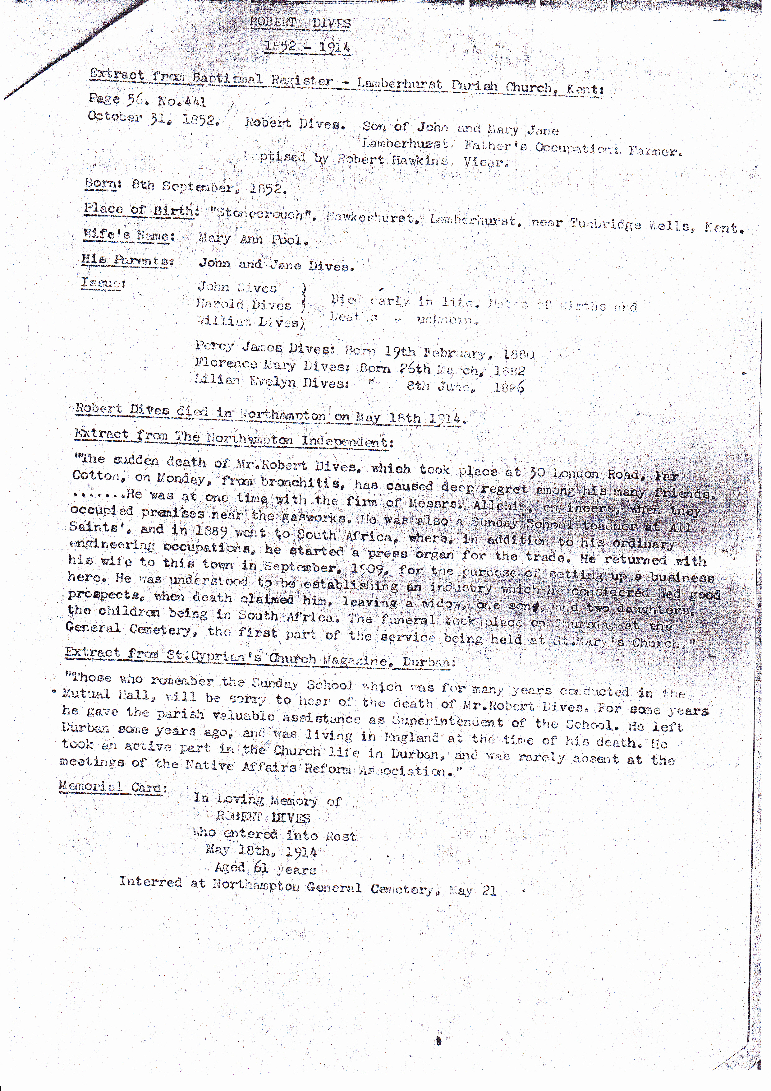 The sudden death of Mr Robert Dives, which took place at 30 London Road, Far Cotton, on Monday, from bronchitis, has caused deep regret among his many friends ..... He was at one time with the firm of Messrs Allchin, engineers, when they occupied premises near the gasworks. He was also a Sunday School teacher at All Saints, and in 1889 went to South Africa, where, in addition to his ordinary engineering occupations, he started a press organ for the trade. He returned with his wife to this town in September, 1909, for the purpose of setting up a business here. He was understood to be establishing an industry which he considered had good prospects, when death claimed him, leaving a widow, one son, and 2 daughters, the children being in South Africa. The funeral took place on Thursday at the General Cemetery, the first part of the service being held at St Mary's Church. Extract from the Northampton Independent.