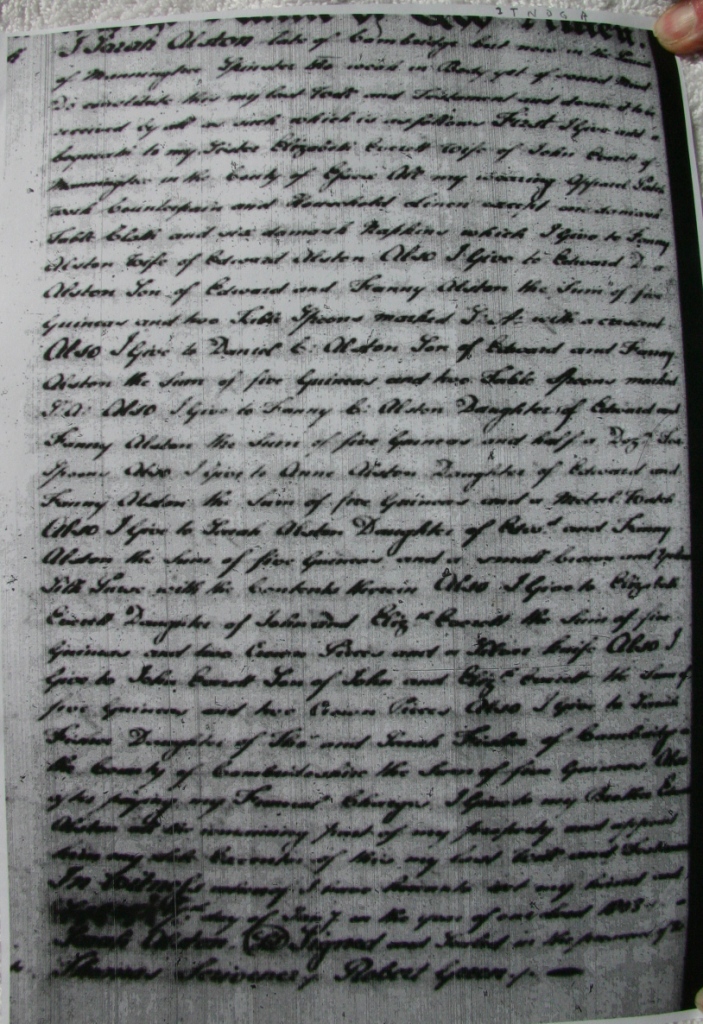 The Will of Sarah Alston. I Sarah Alston late of Cambridge but now in the parish of Manningtree Spinster do . . . . . make this my last Will and Testament and Devise it to be received by all or such which is as follows; First I give and bequeath to my sister Elizabeth Everett wife of John Everett of Manningtree in the County of Essex all by wearing apparell patchwork counterpane and household linen except one damask tablecloth and six damask napkins which I give to Fanny Alston wife of Edward Alston. Also I give to Edward Daniel Alston son of Edward Alston and Fanny Alston (Francis Constable) the sum of five guineas and two tablespoons marked S.A. with a crescent. Also I give to Daniel C. Alston son of Edward and Fanny Alston the sum of five guineas and two tablespoons marked S.A. Also I give to Fanny C. Alston daughter of Edward and Fanny Alston the sum of five guineas and a . . . . . Also idea of two Sarah Alston daughter of Edward and Fanny Alston the sum of five guineas and a small brown and yellow silk gown with the contrast therein. Also I give to Elizabeth Everett daughter of John and Elizabeth Everett the sum of five guineas and two crown pieces. Also I give to Sarah . . . . . daughter of Thomas and Sarah . . . . . of Cambridge in the County of Cambridgeshire the sum of five guineas. Also for paying my funeral charges I give to my brother Edward Alston all the remaining . . . . . of my property and appoint him my . . . . . of this my last Will and Testament. In witness I have hereto set my hand and seal . . . . . day of January in the year of our Lord 1803. Sarah Alston. Signed and sealed in the presence of Thomas Scrivenor and Robert Green. On file ESS PRO Will 1803 Sarah Alston spinster of Manningtree D/ABR 29/566 (High Resolution Copy Available)