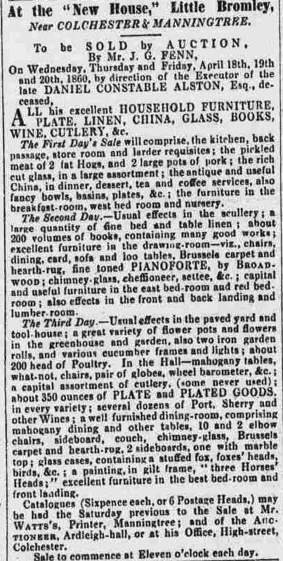 Deaths On the 15th inst., aged 42, Daniel Constable Alston Esq., of Little Bromley." Bury and Norwich Post 20 March 1860.