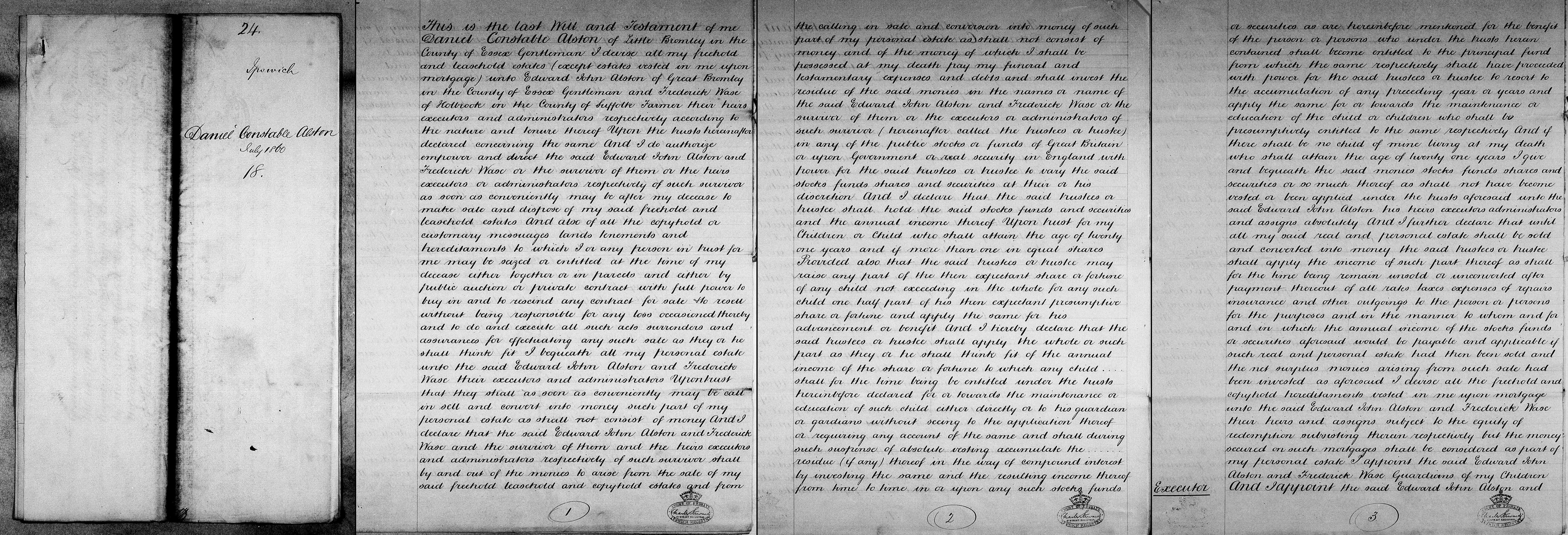 2. Daniel Constable Alston: Will, 1 Mar 1860, Little Bromley ESS. Daniel died a widower leaving a young family, his estate was left in trust for his children's benefit to his Executors and Trustees his brother Edward John Alston of Gt Bromley ESS, and brother in law Frederick Wase of Holbrook SFK.
