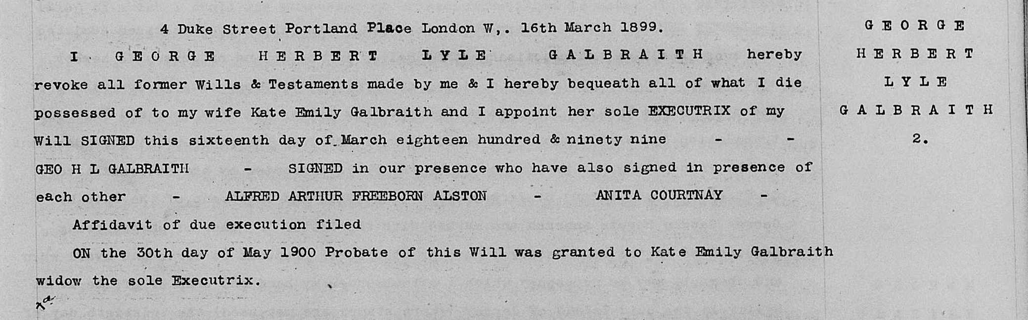 1. George Herber Lyle Galbraith: Will, 16 Mar 1899. George married Kate Emily Allcock ROBINSON [3870] [MRIN: 1332], daughter of Edward ROBINSON [27013] and Unknown, on 16 Mar 1899 in All Souls St Marylebone LND. (Kate Emily Allcock ROBINSON [3870] was born on 26 Apr 1854 in Derby DBY and died on 2 Oct 1943 in Kent England.) |