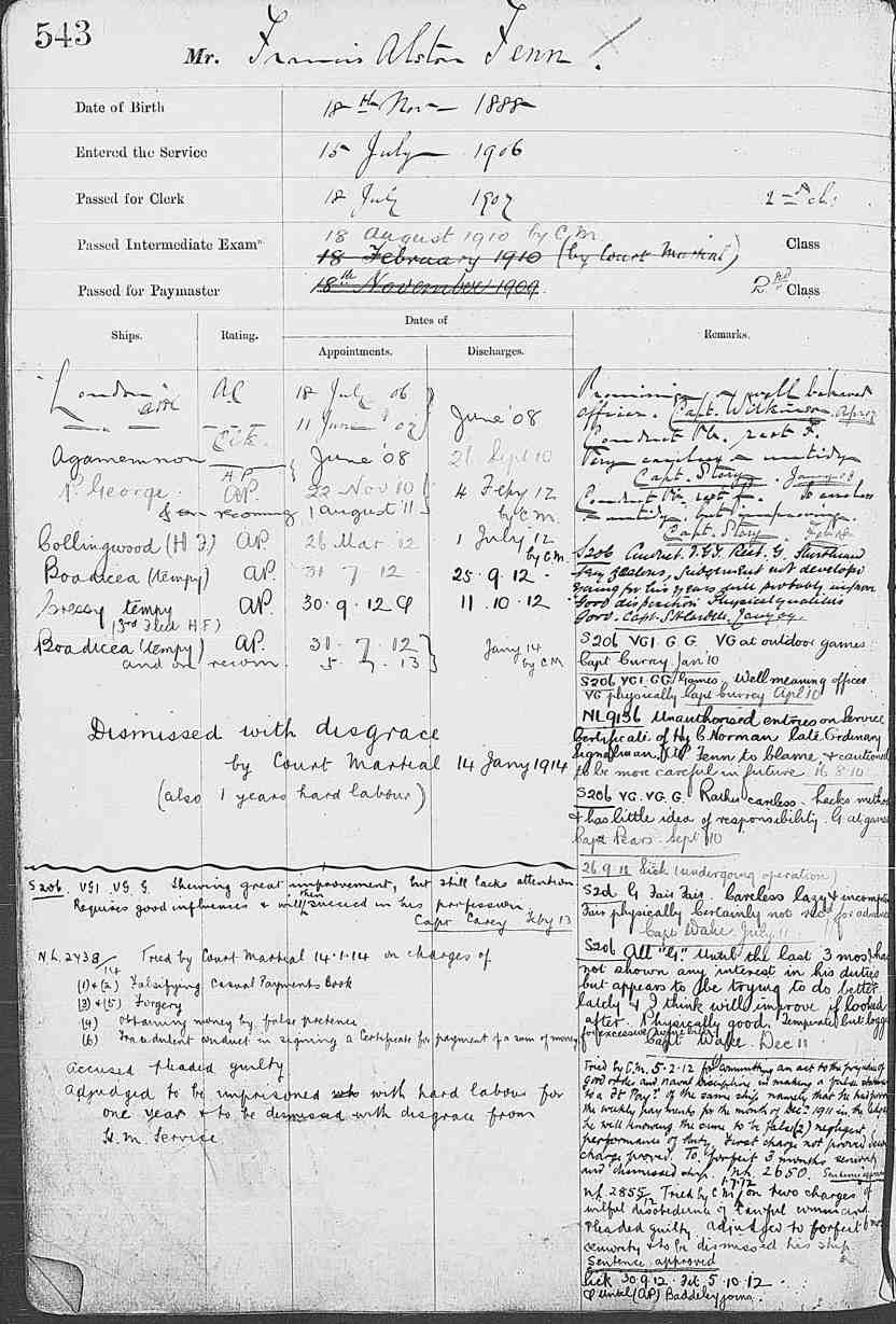 Extracts From Franks Naval Service Record: Apr 1907 - Promising a well behaved Officer Jan 1908 - Conduct VG very careless and untidy Jan 1909 - Conduct VGS very zealous judgment not developed young for his years will, probably improve good disposition VG outdoor games Aug 1910 - Unauthorised entries entries on service certificate of H C Norman . . . . . Fenn to blame and cautioned to be more carefull. . . . . Sep 1910 - VG VG G Rather careless lacks method and has little idea of responsibility Sep 1911- Sick underging operation Jul 1911 - G Fair Fair careless lazy incompetent fair physically certainly not rec'd for advancement Dec 1911 - All G until last 3 months not shown any interest in his duties but appears to be trying to do better lately & I think will improve if looked after. Physically good. Temperate but logged for excessive wine bill 5 Feb 1912 - Tried by CM for (1). . . . . making a false statement . . . . . that he had filled the weekly payments for the month . . . . . in the ledger he well knowing the same to be false (2) Negligent performance of duty. First charge not proved second charge proved . . . . . forfeit 3 mths seniority, dismissed ship. 1 Jul 1912 - Tried CM on two charges of wilfil disobedience of lawful command. Pleaded guilty forfeit 6 mths seniority dismissed ship 30 Sep 1912 - Sick fit 5 Oct 12 Feb 1913 - VG1 VG G Showing great improvement, but still lacks attention, Requires good influences and will then succeed in his profession. 14 Jan 1914 Tried by CM (1&2) falsifiying Casual Payments Book (3 &5) Forgery (4) Obtaining money by false pretence (6) Fraudlent conduct in signing a Certificate for payment of a sum of money. Accused pleaded guilty. Adjudged imprisoned with hard labour for one year, dismissed with disgrace from HM Service. Ref: National Archives ADM/196/171 Image 428
