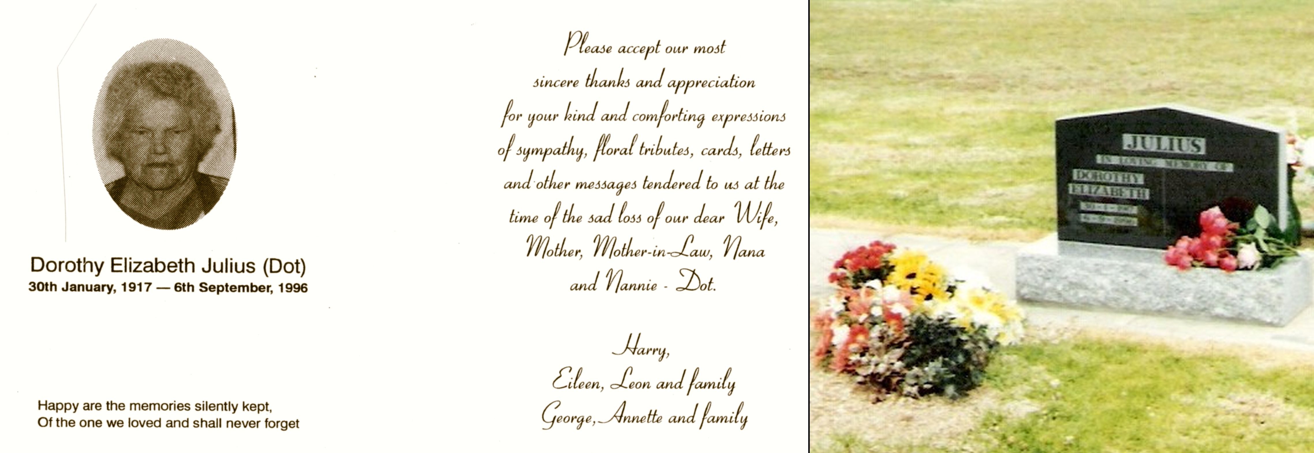 3. Dorothy Elizabeth Julius: Funeral thank you note and grave at Ashford. Dorothy married Henry (Harry) George Archibald JULIUS [889] [MRIN: 1536], son of Archibald Cowper "Arch" JULIUS [884] and Clara Ann EVANS [885], on 28 Dec 1942 in Tamworth. (Henry (Harry) George Archibald JULIUS [889] was born on 16 Jan 1916 in Sydney NSW Australia, baptised on 18 Dec 1916 in St Pauls Emmaville NSW, died on 27 Dec 1998 in Yamba-gunya Ashford NSW and was buried in Ashford NSW.). The cause of his death was killed fighting a bush fire. Dorothy next married WOODS [7391] [MRIN: 2466]. |
