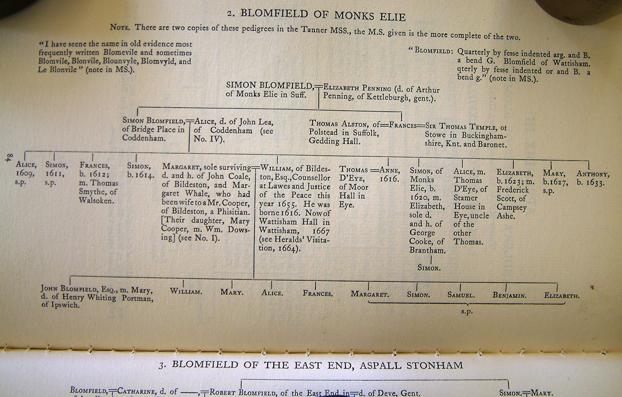 William Blomfield = Anne Cutting Simon Blomfield of Monks Eleigh = Elizabeth, da. of Arthur Penning of Kettleburgh, Esq. their children Simon Blomfield of Coddenham died 1633 = Alice, da. of John Lea of Coddenham (this is the father of Frances. (Alice = 2ndly Wm. Cage, Portman of Ipswich.) William Blomfield of Stoneham = Margaret, da. and Heir of George Clench of Bealings, esq. and they had a daughter Margaret. William = 2ndly Mary, da. of Wm. Fiske of Rattlesden and had a son Wm.