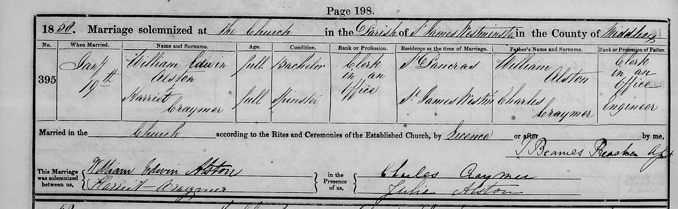 1. Census: England, 8 Apr 1861, 7 Pembury Villas St John Hackney. William is recorded as head of house married aged 38 a bank clerk born St Pancras MDX William married Harriet CRAYMER [4723] [MRIN: 529], daughter of Charles CRAYMER [24392] and Unknown, on 19 Jan 1858 in St James Westminster London. (Harriet CRAYMER [4723] was born about 1828 in Limehouse MDX.) |