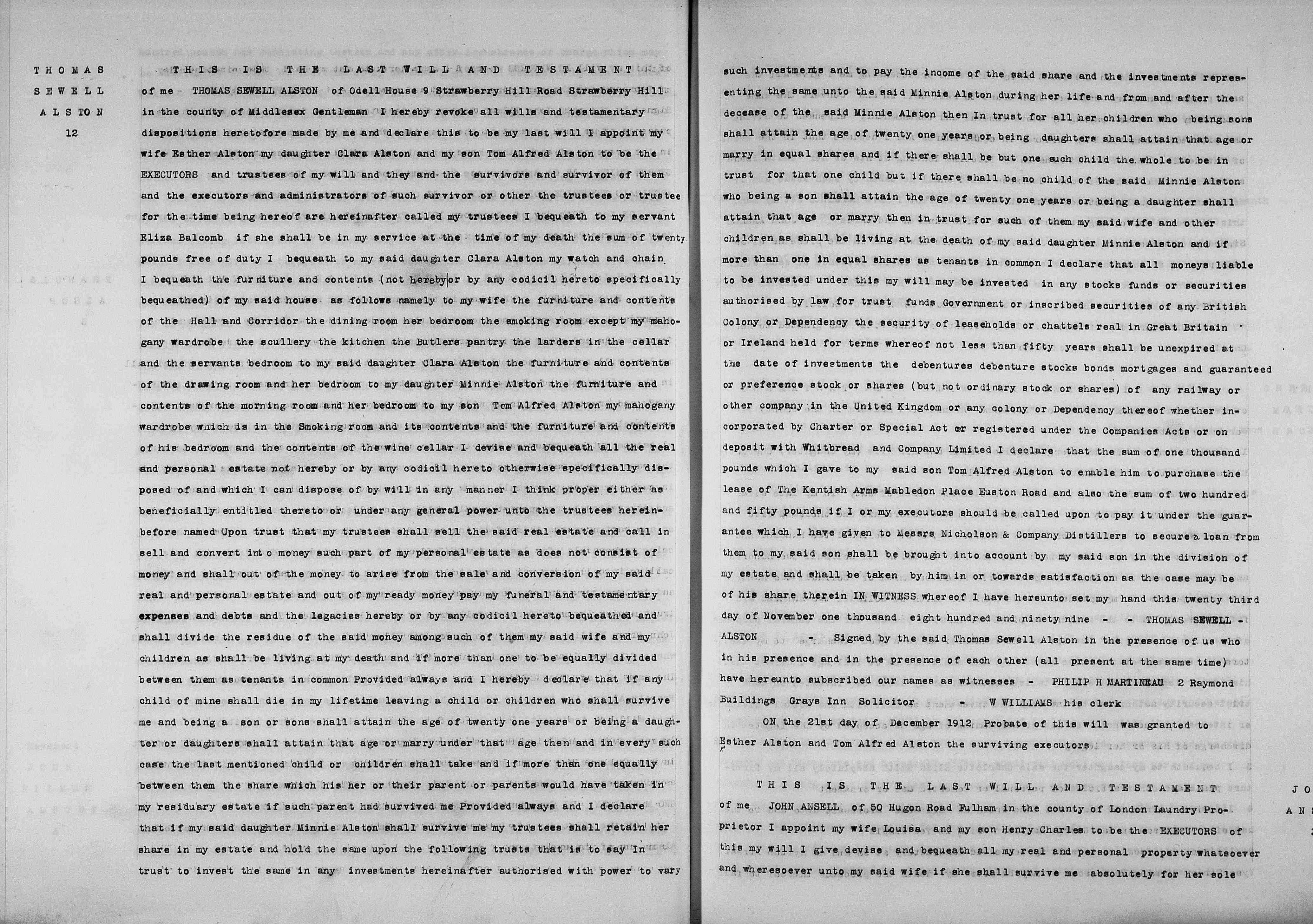 9. Thomas Sewell Alston: Will, 23 Nov 1899, Middlesex LND. THIS IS THE LAST WILL AND TESTAMENT of me THOMAS SEWELL ALSTON of Odell House 9 Strawberry Hill Road Strawberry Hill in the county of Middlesex Gentleman I hereby revoke all wills and testamentary dispositions heretofore made by me and declare this to be my last will I appoint my wife Esther Alston my daughter Clara Alston and my son Tom Alfred Alston to be the EXECUTORS and trustees of my will and they and the survivors and survivor of them and the executors and administrators of such survivor or other the trustees or trustee for the time being hereof are hereinafter called My Trustees I bequeath to my servant Eliza Balcomb if she shall be in my service at the time of my death the sum of twenty pounds free of duty I bequeath to my said daughter Clara Alston my watch and chain. I bequeath the furniture and contents (not hereby or by any codicil hereto specifically bequeathed) of my said house as follows namely to mywife the furniture and contents of the Hall and Corridor the dining room her bedroom the smoking room except my Mahogany wardrobe the scullery the kitchen the Butlers. pantry, the larders in the cellar and the servants bedroom to my said daughter Clara Alston the furnitulre and contents of the drawing room and her bedroom to my daughter Minnie Alston the furniture and contents of the morning room and her bedroom to My son Tom Alfred Alston my mahogany wardrobe which is in the Smoking room and its contents and the furniture and contents of his bedroom and the contents of the wine cellar I devise and bequeath all the real and personal estate not hereby or by prior codicil hereto otherwise specifically disposed of and which I can dispose of by will in any manner think proper either as beneficially entitled thereto or under any general power the trustees hereinbefore named Upon trust that my trustees shall sell the said real estate and call in sell and convert into money such part of my personal estate as does not consist of money and shall out of the money to arise from the sale, and conversion of my said real and personal estate and out of my ready money pay my funeral and testamentery expenses and debts and the legacies hereby or by any codicil hereto bequeathed and shall divide the residue of the said money among such of them my said wife and my children as shall be living at my death and if more than one to be equally divided between them as tenants in common Provided always and I hereby declare that if any child of mine shall die in my lifetime leaving a child or children who shall survive me and being a son or sons shall attain the age of twenty one years or being a daughter or daughters shall attain that age or marry under that age then and in every such case the last mentioned child or children shall take and if more than one equally between them the share which his her or their parent or parents would have taken in my residuary estate if such parent had survived me provided always and I declare that if my said daughter Minnie Alston shall survive me (my trustees shall retain her share in my estate and hold the same upon the following trusts that is to say in trust to invest the same in any investments hereinafter authorised with power to vary such investments and to pay the income of the said share and the investments representing the same unto the said Minnie Alston during her life and from and after the decease of the said Minnie Alston then In trust for all her children who being sons shall attain the age of twenty one years or being daughters shall attain that age or marry in equal shares and if there shall be but one such child the whole to be in trust for that one child but if there shall be no child of the said Minnie Alston who being a son shall attain the age of twenty one years or being a daughter shall attain that age or marry then in trust for such of them my said wife and other children as shall be living at the death of my said daughter Minnie Alston and if more than one in equal shares as tenants in common I declare that all moneys liable to be invested under this my will may be invested in any stocks funds or securities authorised by law for trust funds Government or inscribed securities of any British Colony or Dependency the security of leaseholds or chattels real in Great Britain or Ireland held for terms whereof not less than fifty years shall be unexpired at the date of investments the debentures debenture stocks bonds mortgages and guaranteed or preference stock or shares (but not ordinary stock or shares) of any railway or other company in the United Kingdon or any colony or Dependency thereof whether incorporated by Charter or Special Act registered under the Companies Acts or on deposit with Whitbread and Company Limited I declare that the sum of one thousand pounds which I gave to my said son Tom Alfred Alston to enable him to purchase the lease of The Kentish Arms Mabledon Place Euston Road and also the sum of two hundred and fifty pounds if I or my executore should be called upon to pay it under the guarantee which I have given to Messrs Nicholson & Company Distillers to secure a loan from them to my said son shall be brought into account by my said son in the division of my estate and shall, be taken by him in or towards satisfaction as the case may be of his share therein IN WITNESS whereof I have hereunto set my hand this twenty third day of November one thousand eight hundred and, ninety nine THOMAS SEWELL ALSTON Signed by the said Thomas Sewell Alston in the presence of us who in his presence and in the presence of each other (all present at the same time) have hereunto subscribed our names as witnesses PHILIP H MARTINEAU 2 Raymond Buildings Grays Inn Solicitor W WILLIAMS his clerk ON the 21st day of December 1912 Probate of this will was granted to Esther Alston and Tom Alfred Alston the surviving executors