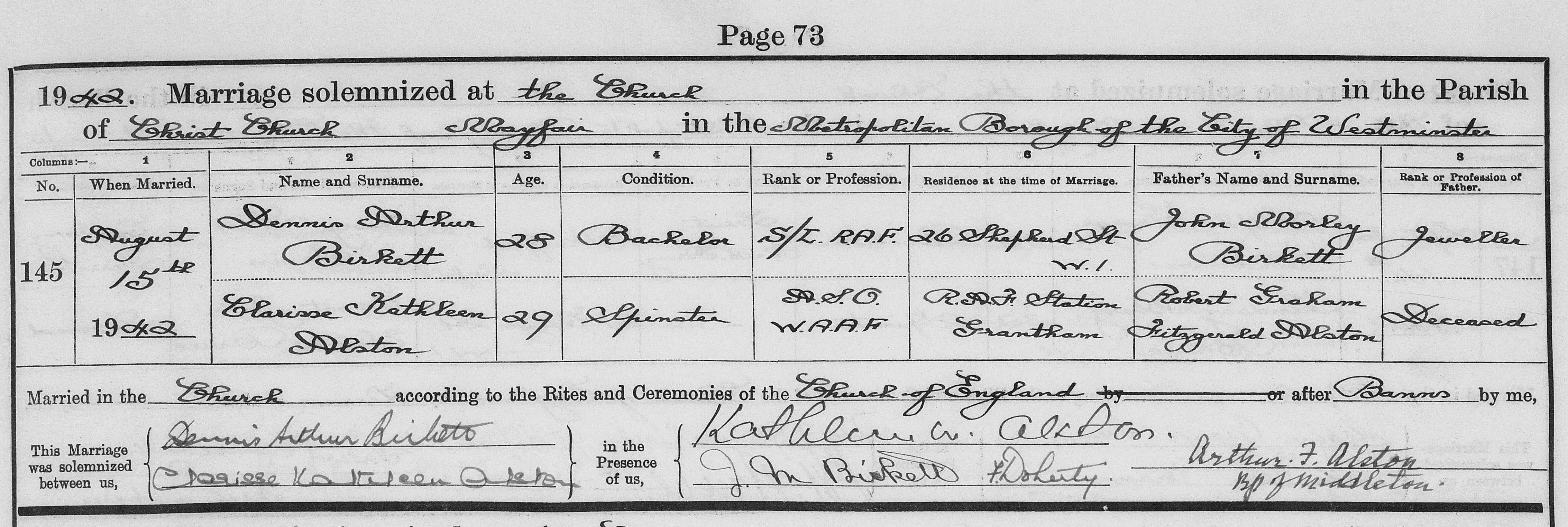 Dennis married Clarissa Kathleen ALSTON [4835] [MRIN: 1658], daughter of Robert Graham Fitzgerald ALSTON [78] and Kathleen May KIRK [4834], on 15 Aug 1942 in Christ Church Mayfair Westminster. (Clarissa Kathleen ALSTON [4835] was born on 29 Apr 1913.) |