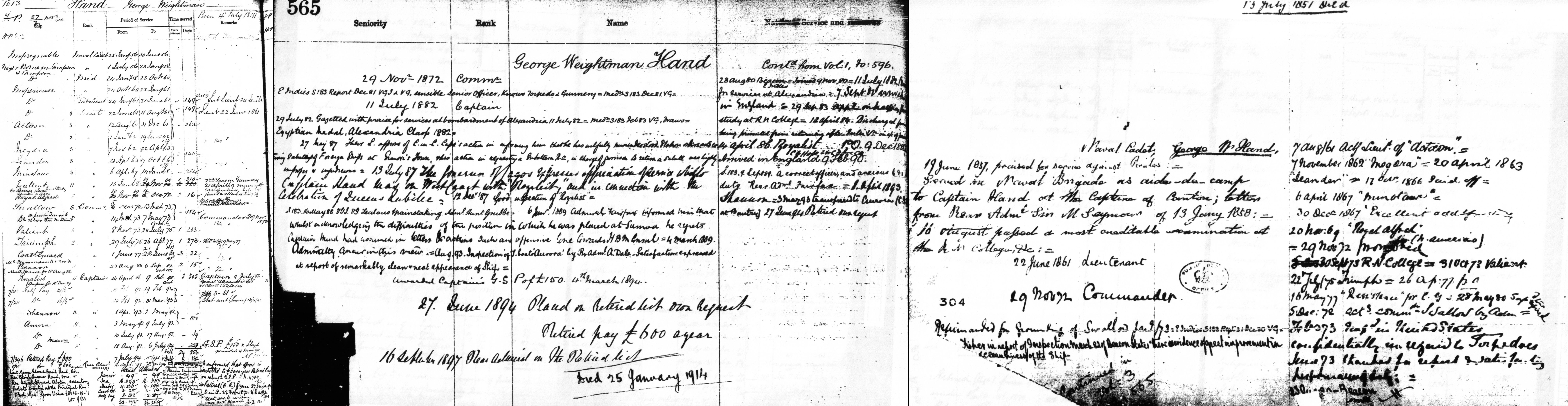 London Gazette. Announcing special promotion made in Her Majesty's Fleet for services rendered at the attack on forts at Alexandria on July 11th. . . . . . Commander George Weightman Hand. . . . . To Captain on completing the necessary sea time to qualify him for the rank. Ref: Dundee Evening Telegraph 9 August 1882.