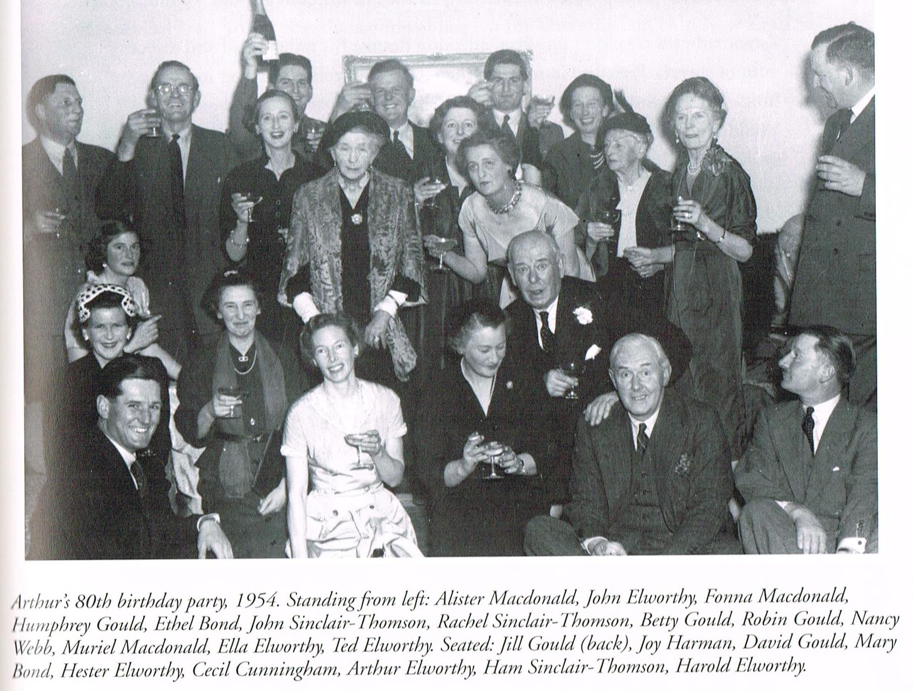 3. Arthur Elworthy: His 80th Birthday, 26 Jul 1954. L to R (Back) Alistair Macdonald, John Elworthy, Humprey Gould, John Sinclair-Thomson, Robin Gould, Nancy Webb, Ella Elworthy, Ted Elworthy. Next Row Forward: Fionna Macdonald, Ethel Bond, Rachel Sinclair-Thomson partly obscured, Betty Gould, Muriel Macdonald.-feather in hat. Next: Jill Gould, Arthur Elworthy. Next: Jill Harman, Mary Bond, Hester Elworthy, Cecil Batchelor, Ham Sinclair-Thomson, Harold Elworthy. Front: David Gould.
