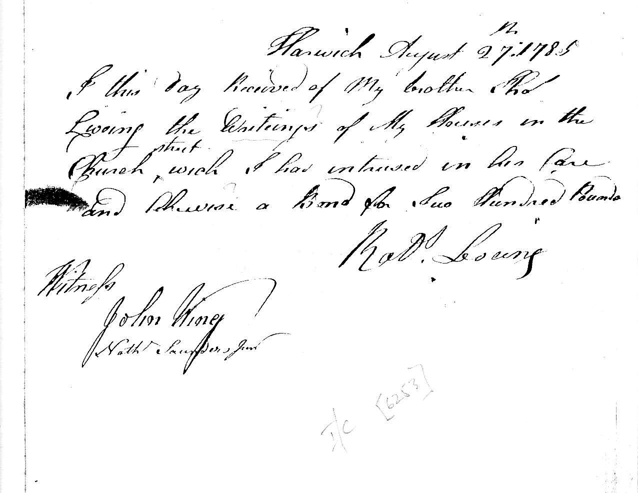 Harwich August 27th 1785 I this day received of my brother Thos Liveing the writings (?) of my houses in the Church Street which I had intrusted in his care and . . . . . vise a Bond for Two Hundred Pounds Robt Liveing Witnefs: John Wing. Nath Saunders Jnr. D/DU 206/12 ESS RO