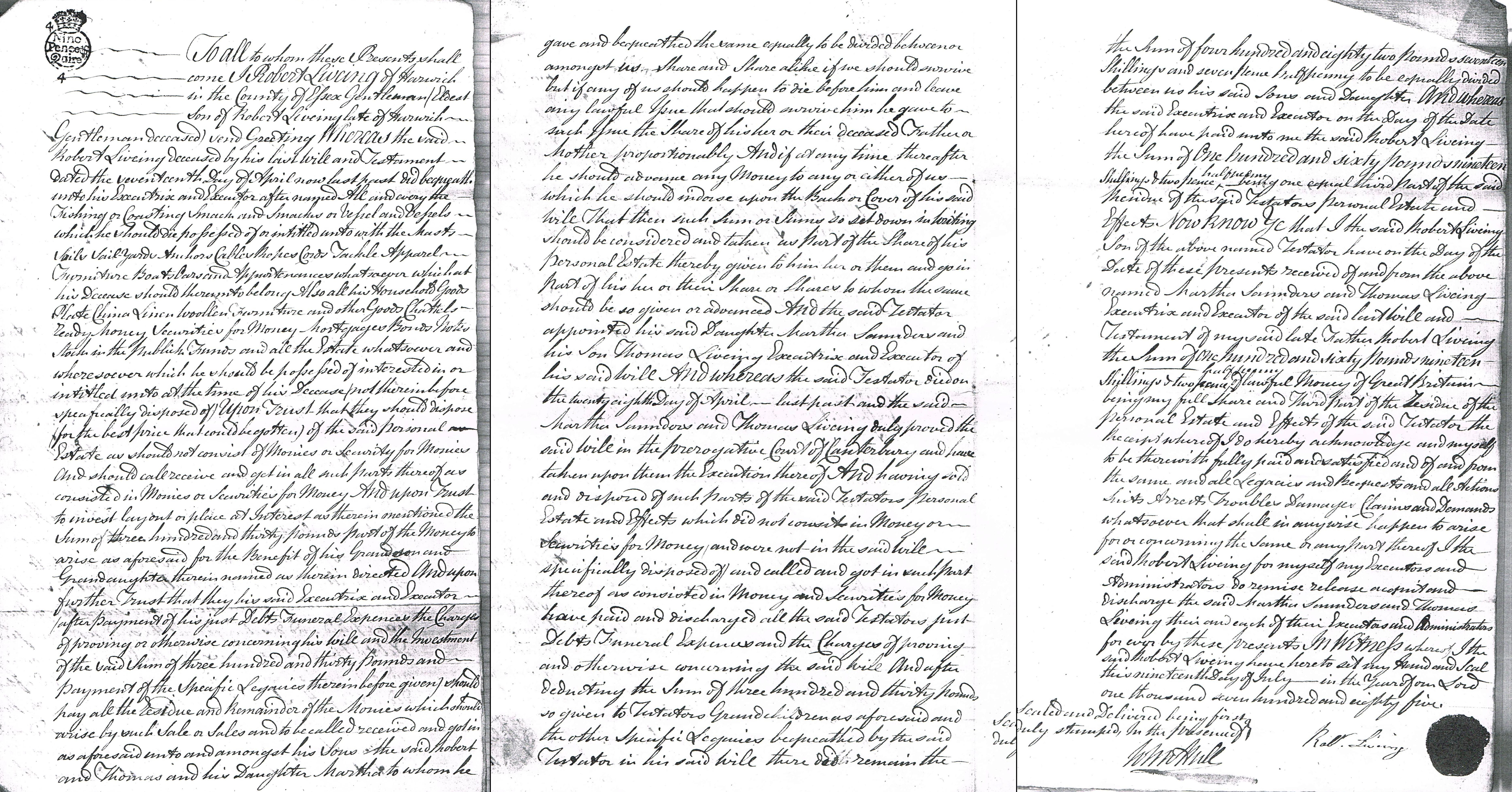 1. Robert Liveing: Receipt and Discharge for Legacy from his father Robert Liveing [427], 19 Jul 1785, Harwich. To all to whom these presents shall come I Robert Liveing of Harwich in the County of Essex Gentlemen (eldest son of Robert Liveing late of Harwich Gentlemen deceased) send greetings Whereas the said Robert Liveing deceased by his last will and testament dated the 17th day of April now last past did bequeath unto his Executrix and Executor therein and hereinafter named or the survivor of them all the executors or administrators of such survivor All and every the fishing or coasting smack and smacks or vessel or vessels which he should die possessed of or entitled unto with the masts sales saleyards anchors cables ropes cords tackle apparel furniture boats oars and appurtenances whatsoever which at his decease should thereunto belong Also all his household goods plate china linen woollen furniture and other goods chattels ready money securities for money mortgages bonds notes stock in the public funds and all the estate both real and personal which he should be possessed of interested in or entitled unto at the time of his decease (not therein before by him specifically disposed of) Upon Trust that they should dispose (for the best price that could be gotten) of the said personal estate as should not consist of monies or security for money And should call receive and get in all such parts thereof as consisted in monies and securities for money And Upon Trust to invest layout or place at interest the sum of £330 part of the money to arise as aforesaid for the benefit of his grandson and grand daughter therein named as therein directed And upon further trust that they his said Executrix and Executor (after payment of his just debts funeral expenses is the charges of proving or otherwise concerning his will and the investment of the said sum of £330 and payment of the specific legacies therein before given) should pay all the residue and remainder of the monies which should arise by such sale or sales and to be called received and got in as aforesaid unto and amongst his sons the said Robert and Thomas and his daughter Martha to whom he gave and bequeathed the same equally to be divided between or amongst us share and share alike if we should survive but if any of us should happen to time for and leave any lawful issue that should survive him he give to such issue the share of his her of their deceased father or mother proportionately And if at any time thereafter he should advance any money to any or either of us which he should endorse upon the back or cover of his said will That then such sum or sums so set down in writing should be considered and taken as part of the share of his personal estate thereby given him her or them and go in part of his her on their share or shares to whom the same should be given or advanced And the said Testator appointed his said daughter Martha Saunders and his son Thomas Liveing executrix and executor of his said will And whereas the said testator died on the 28th day of April last past and the said Martha Saunders and Thomas Liveing duly proved the said Will in the prerogative Court of Canterbury and have taken upon them the execution thereof And having sold and disposed of such parts of the said testator's personal estate and effects which did not consist of money or securities money and were not in the said Will specifically disposed of and call and got in such part thereof as consisted in money and securities for money have paid and discharged all the said testator's just debts funeral expenses and the charges of proving and otherwise concerning the said Will And after deducting the sum of £330 so given to Testator's grandchildren aforesaid and the other specific legacies bequeathed by this said Testator in his said Will their did remain the sum of £482.17 shillings and seven pence half penny to be expressly divided between us his said Sons and Daughter And whereas the said Executrix and Executor on the day of the date hereof have paid unto me the said Robert Liveing the sum of £160.19 shillings and 2 pence half penny being one equal third part of the said residue of the said Testator's personal estate and effects. Now know ye that I the said Robert Liveing son That of the above-named testator have on the day of the date of these presents received of and from the above named Martha Saunders and Thomas Liveing Executrix and Executor of the said last Will and Testament of my said late father Robert Liveing the sum of £160.19 shillings and two pence half penny of lawful money of Great Britain being full share and third part of the residue of the personal estate and effects of the said Testator the receipt where of I do here by acknowledge and myself to be therewith fully paid and satisfied and of and from the same and all legacies and bequests and all actions suits arrests troubles damages claims and demands whatsoever that shall in anywise happen to arise for or concerning the same or any part thereof I either said Robert Liveing for myself my Executors and Administrators do remise release accept and discharge the said Martha Saunders and Thomas Liveing there and each of them Executors and Administrators for ever by these presents. In witness whereof I the said Robert Liveing have hereto set my hand and seal this 19th day of July in the year of our Lord 1785. Robt Liveing Sealed and delivered being first duly stamped in the presence of John Hull. Ref ESS RO 1775 D/DU 206/10 - 2003