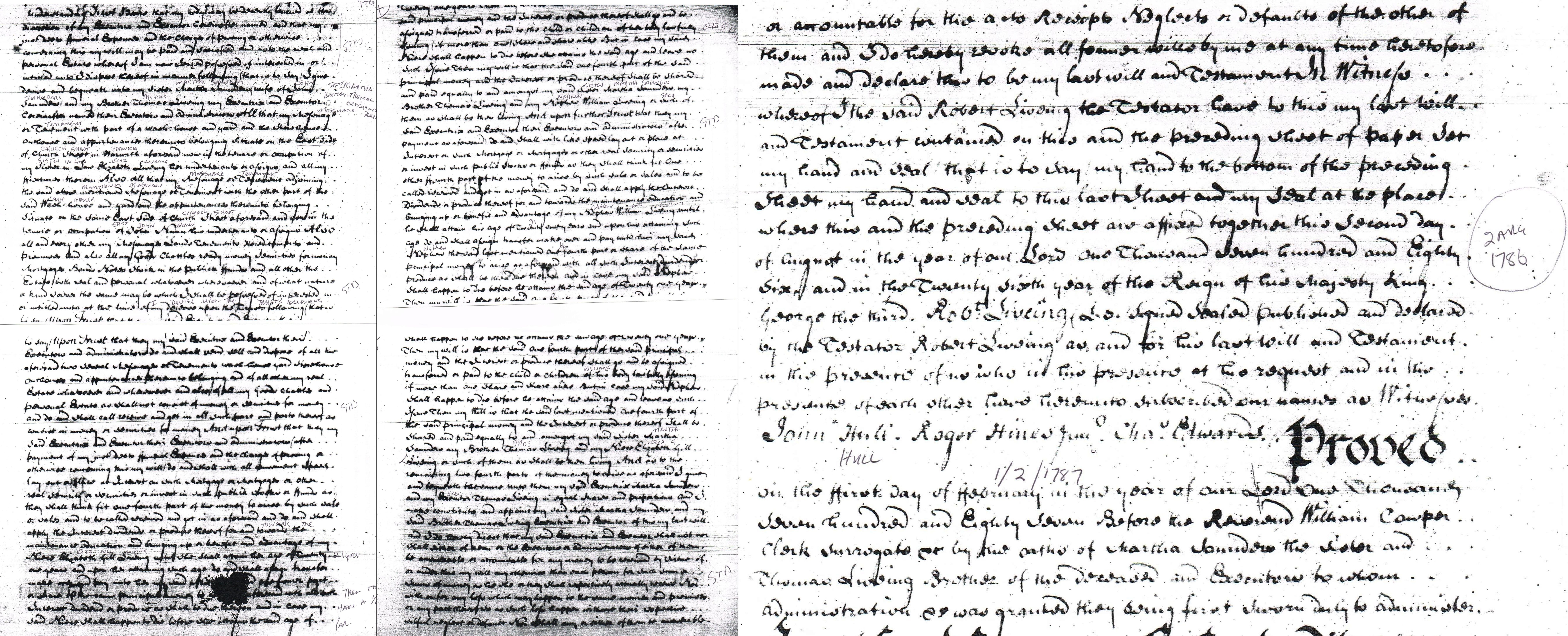 2. Robert Liveing: Will, 2 Aug 1786, Harwich. WILL OF ROBERT LIVEING. This is the last Will & Testament of me Robert Liveing of Harwich, Gentleman being at the time of making thereof in sound mind and understanding. I give devise and bequeath unto my sister Martha Saunders (wife of John Saunders) and my brother Thomas Liveing my Executrix and Executor my messuage and tenement with part of a washhouse and yard situate on the east side of Church Street in Harwich in the tenure or occupation of my Sister in Law Elizabeth Liveing. Also all that messuage and tenement adjoining the said above messuage and tenement with the other part of the washhouse and garden situate on the same east side of Church Street aforesaid in the tenure and occupation of John Nunn. Also all and every other of my Lands Messuage Tenements Goods Chattels ready money mortgages bonds etc etc I devise Upon Trust that they my said Executrix and Executor shall sell and dispose of all the aforesaid as shall not consist of money or securities for money. And Upon Trust my Executrix and Executor after payment of my just debts and charges lay out at interest or mortgage or other real security or invest as they see fit. To apply one fourth part of the interest dividends or produce thereof towards the maintenance education and bringing up of my niece Elizabeth Gill Liveing until she shall attain her age of 21 years when she shall be paid one fourth part or share of the principle money aforesaid To apply one fourth part of the interest dividends or produce thereof towards the maintenance education and bringing up of my nephew William Liveing until he shall attain his age of 21 years when he shall be paid one fourth part or share of the principle money aforesaid. And as to the remaining two fourth parts of the money to arise as aforesaid I give and devise unto them my said Executrix Martha Saunders and my Executor Thomas Liveing in equal shares and proportions and I make constitute and appoint my said sister Martha Saunders and my said brother Thomas Liveing Executrix and Executor of this my last Will and Testament revoking all former Wills by me I set my hand and seal to it this second day of August 1786 Signed Robert Liveing Witnessed by John Hull, Roger Hines Jnr., Charles Edwards. Proved 1 Feb 1787 by Martha Saunders sister and Thomas Liveing brother of the deceased. Chelmsford PRO Ref ; 10BR 28 D/ABR 28/10 - 2003
