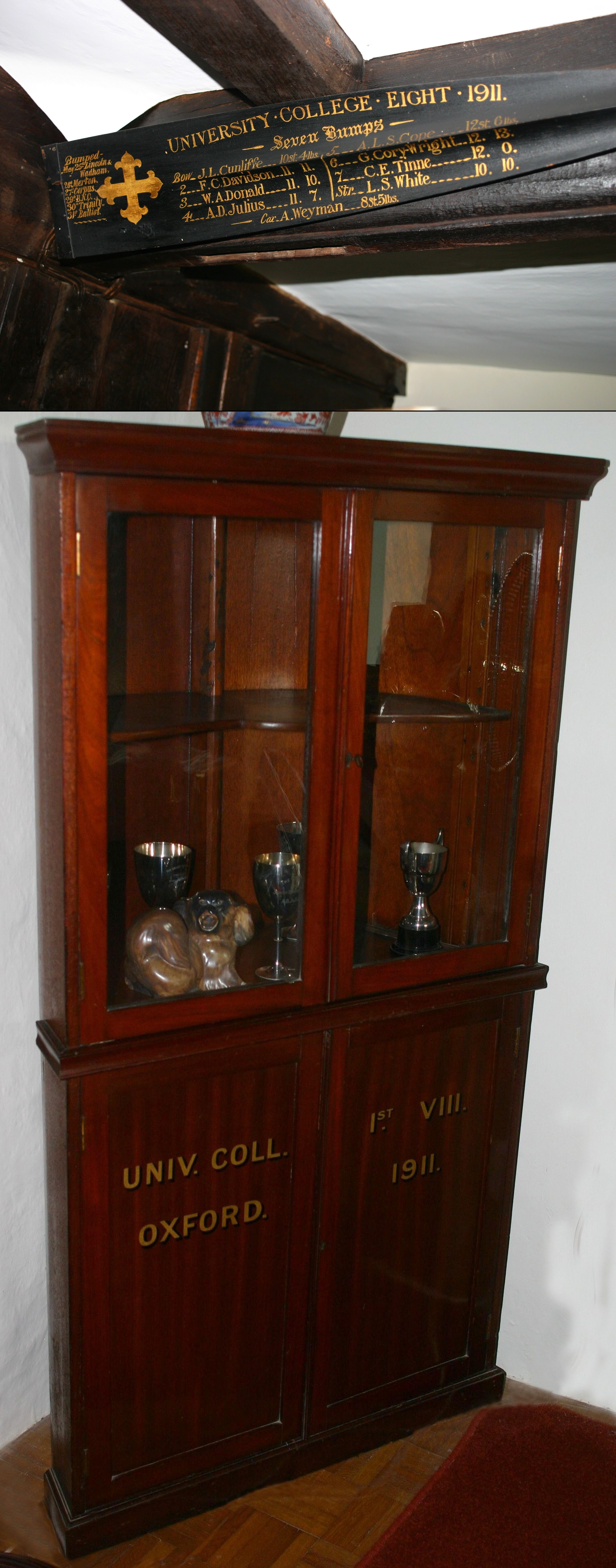 3. Dudley Julius, Cir 1908. Arthur rowed University College Oxford, the image shows a souvenir oar and a cabinet constructed out of a section of his 8's rowing skif.