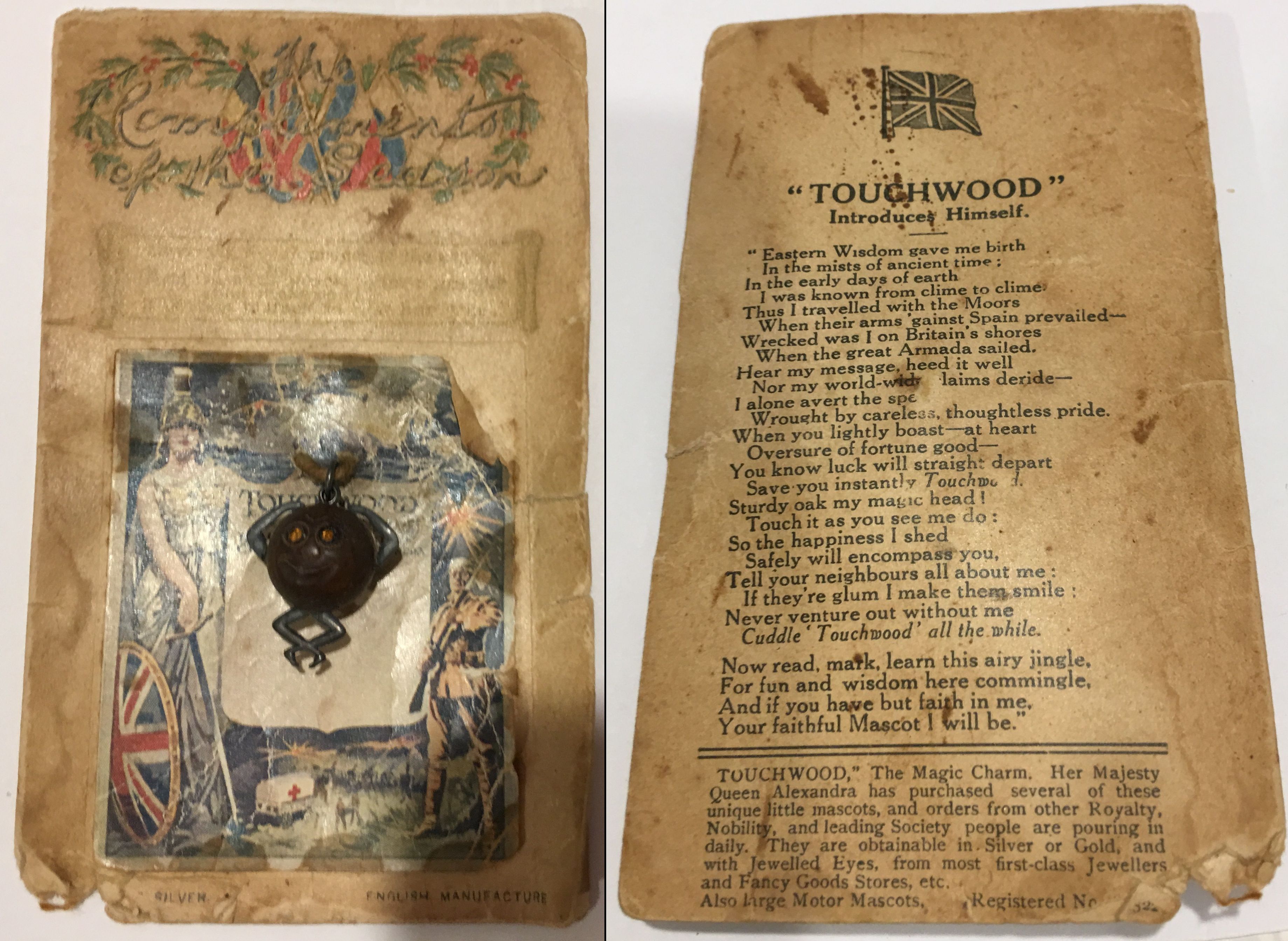 8. Thought to belong to a person in the Julius Family: A Touchwood Charm, WWI. London-based Entrepreneur Mr Henry Brandon created the 'Touch Wud' (as they were known at the time) charm as a good luck token for families, partners and soldiers during World War One.