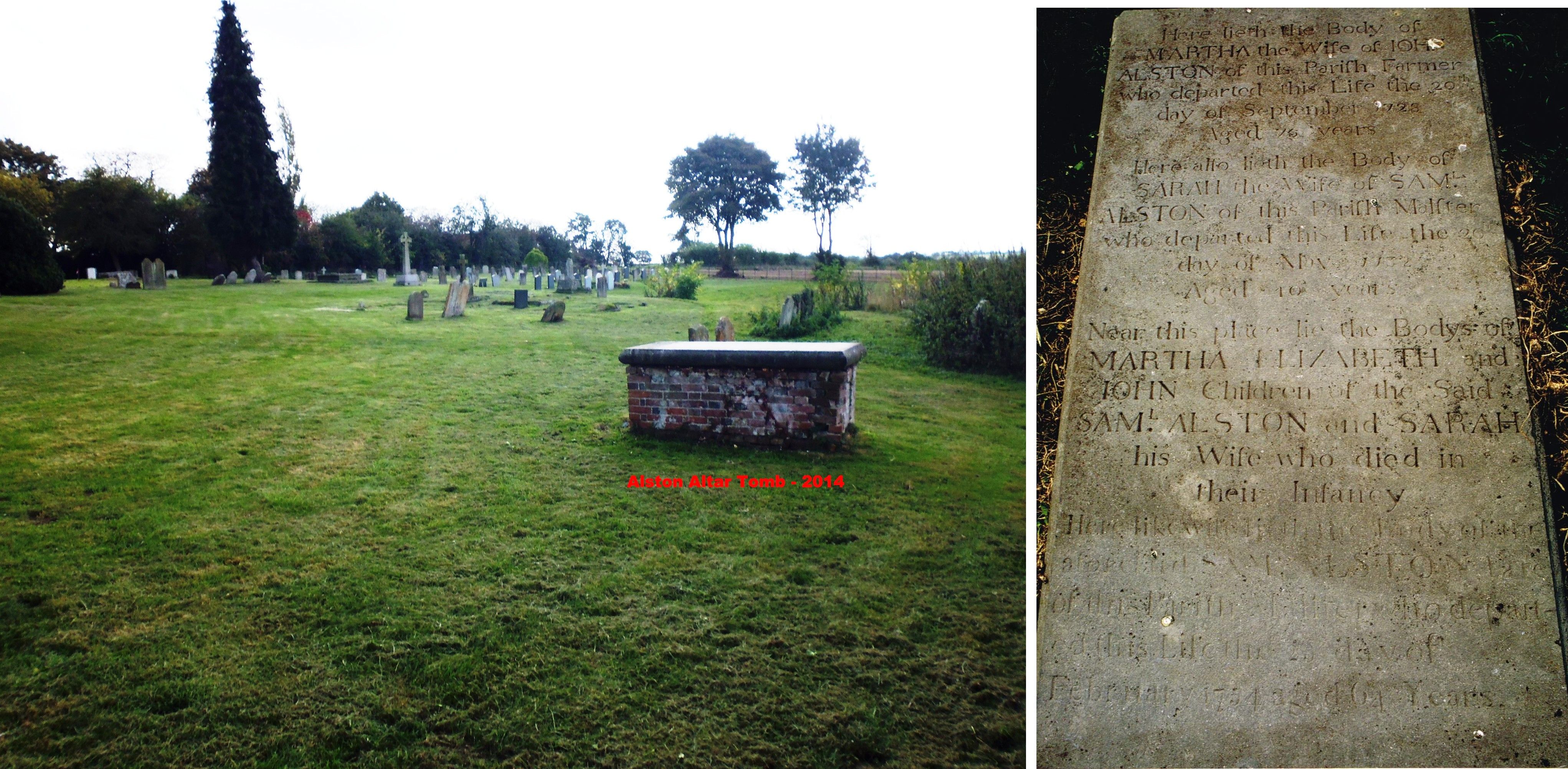 An inscription on an Altar Tomb in churchyard of St Mary the Virgin Edwardstone, reads "Here likewise lieth the body of the aforesaid Saml Alston late of this parish Malster,who departed this life the 23rd day of February 1754 Aged 64 years". Tomb located 2000, cleared by Mrs Tregear of Edwardstone, and photographed.
