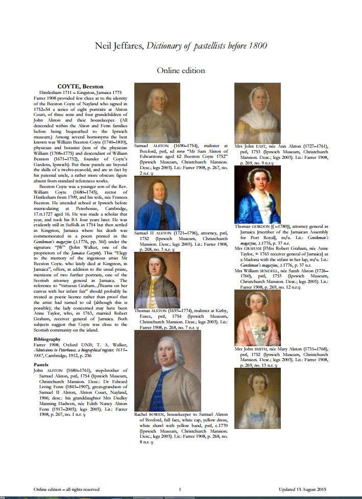 2. Beeston Coyte Pastels: of the Alstons a Yeoman family, 1752-1754, Nayland Suffolk. Article courtesy of Neil Jeffairs - Dictionary of pastellists before 1800. http://www.pastellists.com/Articles/Coyte.pdf#search=%22Alston%22 http://www.pastellists.com/Articles/Coyte.pdf