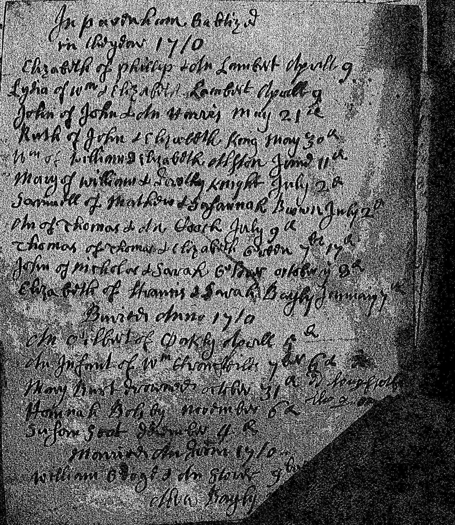 Pavenham Baptisms 1710 Bishops Transcripts William of William & Elizabeth Alston June 11th