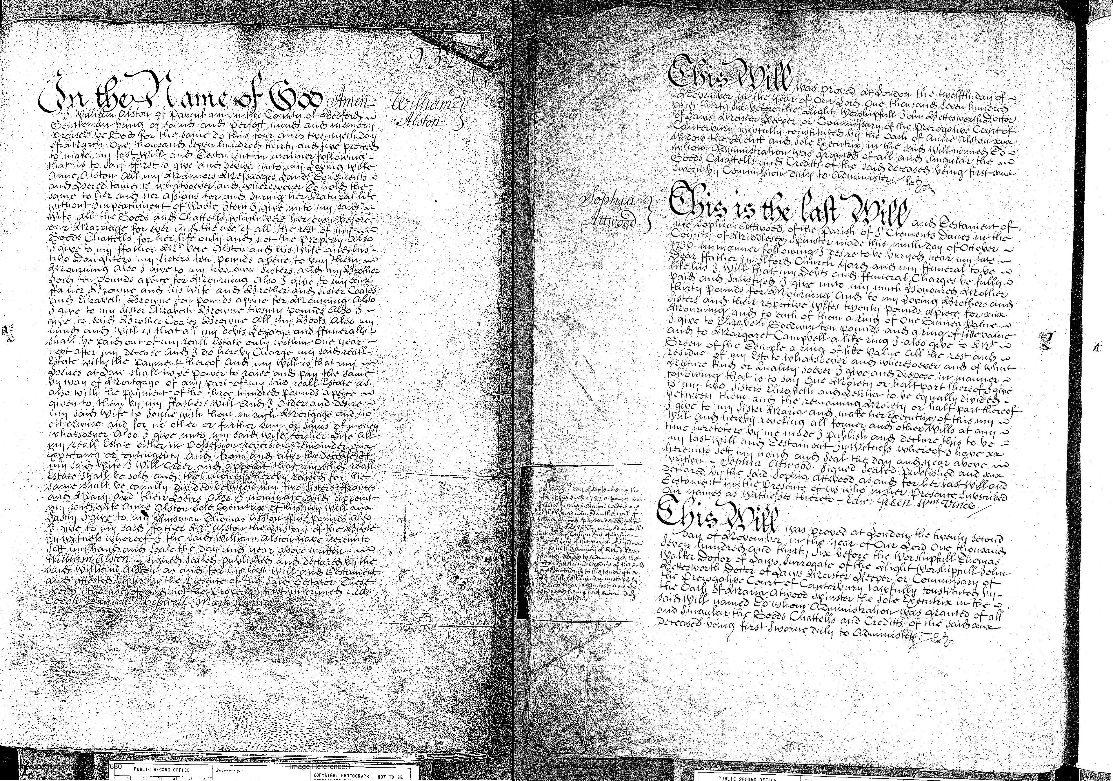 1. William Alston: Will, 24 Mar 1733/34, Pavenham BDF. THE WILL of WILLIAM ALSTON of Pavenham Dated 24 March 1735 William Alston of Pavenham in the County of Bedford Gentleman bequeaths to his wife Anne Alston all his Manors Messuages Lands and Tenements, all the goods and chattels belonging to said wife before her marriage with testator, and the use during her lifetime of all other his goods and chattels. Also I give to my father Mr Vere Alston and his wife, and his two daughters my sisters L10 each to buy mourning. Also I give to my two own sisters and brother Lord L10 apiece for mourning. Also I give to my father Browne and wife and brother and sister Coates1 and Elizabeth Browne L10 each for mourning. To sister Elizabeth Browne L20. To brother Coates Browne1 all his books. Debts, legacies and funerall expenses to be paid out of his real estate, the Heirs at law to raise money by mortgage, particularly the L300 a piece given to them by testator's father's will . . . . . the wife to join in such mortgage. The real estate left to his wife for her life, at her death to be sold and the proceeds to be equally divided between "my two sisters Frances and Mary and their heirs". Appoints Anne Alston the wife sole executrix. To kinsman Thomas Alston L5. To father Mr Alston the History of the Bible. Signed William Alston Witnesses Ed Coock Daniel Hipwell Mark Warner Proved 12th November 1736 by Anne Alston, Relict. Ref Derby 232 PROB 11/680 Q232 Alstoniana Pg 135 Footnote: 1. The IGI records a Coates Brown married Mary Edgley at Milton Ernest (next village to Pavenham) 16 April 1765