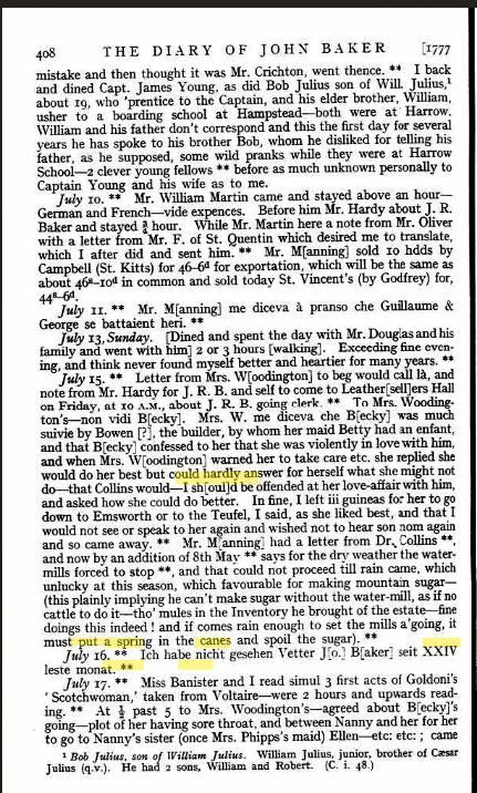 Pg 408 THE DIARY OF JOHN BAKER 1777 " I back and dined Capt. James Young as did Bob Julius [773] son of Will Julius1, about 19 who prentice to the Captain, and his elder brother, William [765], usher to a boarding school at Hampstead - both were at Harrow. William and his father don't correspond and this the first day for several years he has spoke to his brother Bob, whom he disliked for telling his father, as he supposed, some wild pranks while they were at Harrow School. Two clever young fellows. "