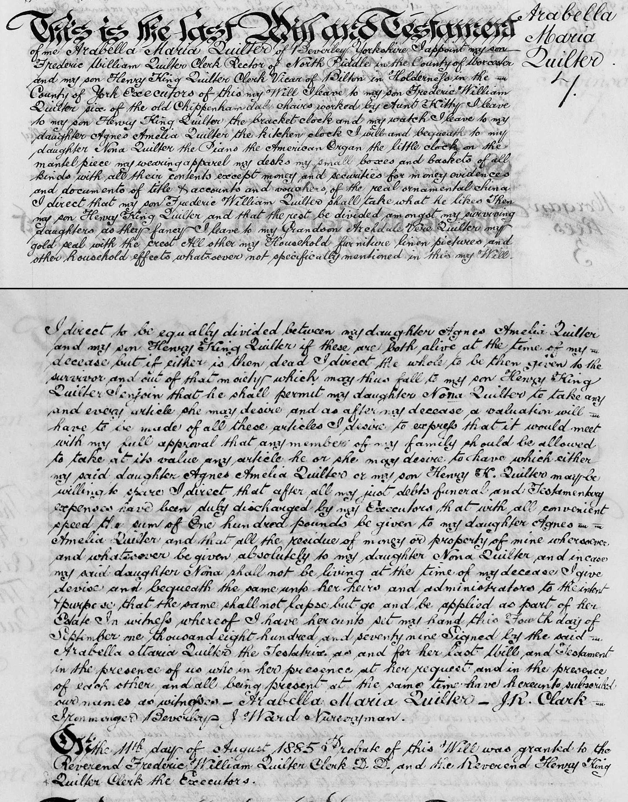 3. Arabella Maria Julius: Will, 4 Sep 1879. This Is the last Will and Testament of me Arabella Maria Quilter of Beverley Yorkshire I appoint my sons Frederick William Quilter Clerk Rector of North Piddle in the County of Worcester and my son Henry King Quilter Clerk vicar of Bilton in the Holderness in the County of York Executors of this my will I leave to my son Frederick William Quilter six of the old Chippendale chairs worked by Aunt Kitty I leave to my son Henry King Quilter the bracket clock and my watch I Leave to my daughter Agnes Amelia Quilter the kitchen clock I will and bequeath to my daughter Nona Quilter the Piano the American Organ the little clock on the mantelpiece my wearing apparel my desks my small boxes and baskets of all kinds with all the contents except money and securities for money evidences and documents of title and accounts and vouchers of the real ornamental china I direct that my son Frederick William Quilter shall take what he likes Then my son Henry King Quilter and that the rest be divided amongst my surviving daughters as they fancy I leave to my grandson Archdale Vere Quilter my gold seal with the crest All other my household furniture linen pictures and other household effects whatsoever not specifically mentioned in this my will I direct to be equally divided between my daughter Agnes Amelia Quilter and my son Henry King Quilter if these are both alive at the time of my decease but if either is then dead I direct the whole to be then given to the survivor and out of that moiety which may thus fall to my son Henry King Quilter I enjoin that he shall permit my daughter Nona Quilter to take any and every article she may desire and as after my decease and valuation will have to be made of all these articles I desire to express that it would meet with my full approval that any member of my family should be allowed to take at its value any article he or she may desire to have which either my said daughter Agnes Amelia Quilter all my son Henry K Quilter may be willing to spare I direct that after all my just debts funeral and testamentary expenses have been duly discharged by my executors that with all convenience be the sum of £100 be given to my daughter Agnes Amelia Quilter and that all the residue of money or property of mine whatsoever and wheresoever be given absolutely to my daughter Nona Quilter and in case my said daughter Nona shall not be living at the time of my decease I give devise and bequeath the same unto her heirs and administrators to the intent and purpose that the same shall not lapse but go and be applied as part of her estate in witness whereof I have here unto set my hand this 4th day of September 1879 Arabella Maria Quilter Signed by the said Arabella Maria Quilter the testatrix as and for her last Will and Testament in the presence of us who in her presence at her request and in the presence of each other and all being present at the same time have here unto subscribed our names as witnesses. J R Clark Ironmongery Beverley John Ward Nurseryman