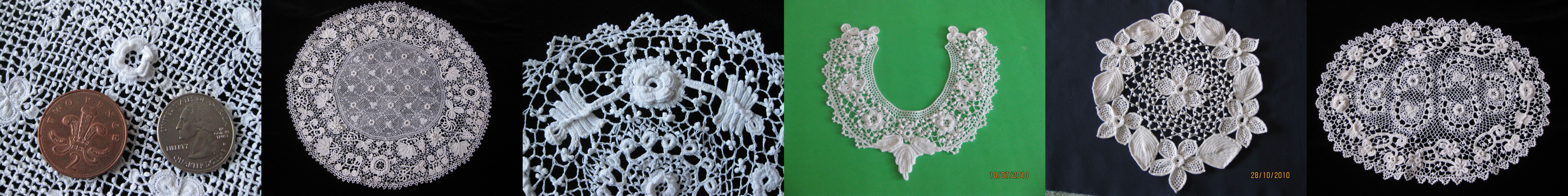 The image is of Clones Lacework showing various doily's and the Clones Knot on the collar on the green background. Courtesy Patricia Tubb - 2012