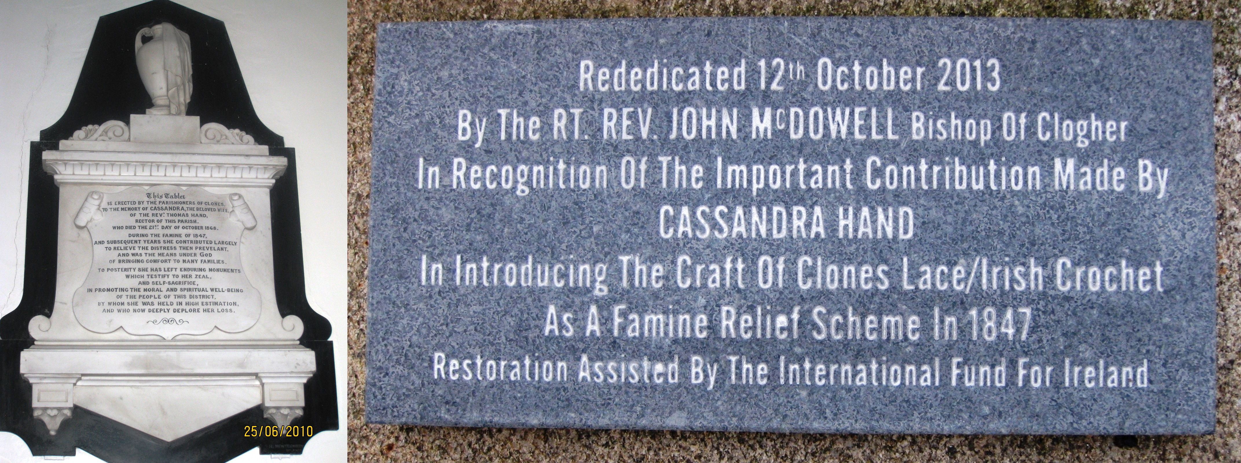 Memorial to Cassandra Hand. Rededicated 12th of October 2013 By The Rt Rev John McDowell Bishop of Clogher In Recognition of the Important Contribution Made by Cassandra Hand In Introducing the Craft of Clones Lace/Irish Crochet As a Famine Relief Scheme in 1847 Restoration Assisted By the International Fund for Ireland.