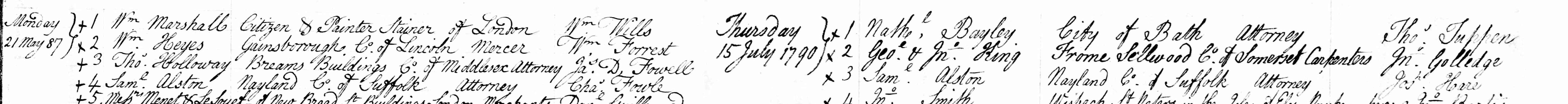 Samuel Alston attorney of Nayland Master, Apprentice James Vanderzee, date of Indenture 16 Sep 1785, date of Duty 14 Oct 1785, Term 1yr 3 mths. Fee L10.0.0 Ref:The Genealogist IR 1/32