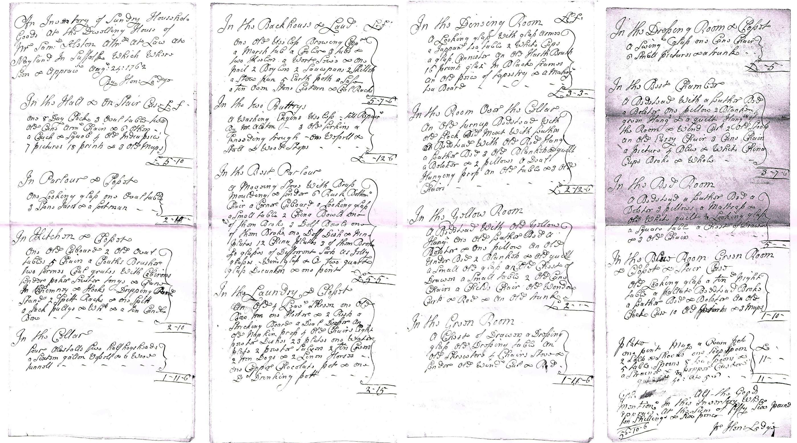 5. Household Inventory: Samuel Alston, 27 Aug 1762, Alston Court Nayland SFK. An inventory of sundry household goods at the dwelling house of Mr Samuel Alston attorney at law at Nayland in Suffolk which were seen and appraised August 27, 1762. By Heny Lodge. In the Hall and on Staircase. One eight-day clock three oval tables five old cane arm chairs and six others a couch and squab in old India pattern seven pictures eighteen prints and three old maps. L5 10s 0d. In Parlour and Closet. One looking glass one oval table three stone jars and a footman. L2 10s 0d. In Kitchen and Closet. One old cupboard 2 old oval tables 5 chairs a cloaths brusher to formes coal grates with col irons fender poker pewter tongs and crane in chimney and hooks dripping pan stand 2 split racks and one split and Jack pulleys and weight and a tin candle box. L2 0s 0d. In the Cellar. Four ale stalls two half hogs heads a 16 gallon vessel and a wood funnell. L1 11s 6d. In the Backhouse and Laundry. One old ? Browning copp a marsh tub and cooler 3 tubs and 2 ? a work line? and one pail two boylors 2 saucepans 2 skillets a store pan five Earth pots a safe a tin oven stone cistern and coal racks L5 7s 6d In the Two Butterys. A washing Engine useless till repair by Mr Alston three old Firkins a kneading trough one vessel and stall? and wood steps. L0 12s 6d In the Best Parlour A moving stove with brass moulding and fender 6 rush bolton chairs a corner cupboard a looking glass a small table 2 china bowls one of them broke 3 Delft bowls one of them broke 1 Delft dish and 9 plates 12 China plates 3 of them broke 40? Glasses of different sorts as jelly glasses wine glass and a two quart glass decanter and one pint. L5 5s 0d. In the Laundry and Closet An old 4 leaf screen one old ? iron one ? and 2 ? A stricking board and Deal Dresser an old napkin press and old chairs light pewter dishes 23 plates one water glass 2 pewter salvers 2 tin covers 2 iron dogs and 2 linen horses one copper chocolate pot and one ditto drinking pot. L2 15s 0d In the Dining Room A looking glass with glass arms a jappaned side? table 2 white cups a glass canister an old hearth brush 16 prints glazed in black frames an old piece of tapestry and a mahogany side? board. L3 3s 0d In the Room Over the Cellar. An old turn up bedstead with old flock bed mixed with feathers a bedstead with red handing? a feather bed 2 old blankets and quilt a bolster and 2 pillows a Deal hanging ? and old table and 3 old chairs. L2 12s 6d In the Yellow Room. A bedstead with old yellow hanging one old featherbed a bolster and one pillow an old under bed 2 blankets and old quilt a small old glass and old chest of drawers a small table 2 old cane chairs a childs chair old window curtains and rod and old trunk. L2 0s 0d. In the Green Room. A chest of drawers a dressing glass old dressing table an old skrowtore? and 4 chairs stove and fender old window curtains and rod. L1 11s 6d. In the Dressing Room and Closet. A swing glass one cane chair 6 small pictures and a trunk. L0 5s 0d. In the Best? Chamber. A bedstead with a featherbed a bolster one pillow 2 blankets green hanging and a gilt hanging of the room and window curtains 2 old stools an old easy chair 3 cane chairs a picture 7 blue & white china cups broke and whole. L3 7s 6d In the Red Room A bedstead a featherbed a bolster 3 pillows a mattress and old white quilt a looking glass a square table a chest of drawers and three old chairs. L5 0s 0d. In the Blew Room Green Room and Closet and Stair Case. Old looking glass and tinned night table a palla? and bedstead broke a feather bed and bolster an old clock case 10 old portraits? and three maps. L1 10s 0d p?Patar? One pint mug a cream pot 2 salts and shovels one scop spoon 5 tablespoons 8 tea spoons a strainer and a pepper crusher L11 0s 0d All the goods mentioned in this infantry were appraised at the sum of L56.10s 6d per Heny Lodge. Inventory in Other Records file, it uses many abbreviations.