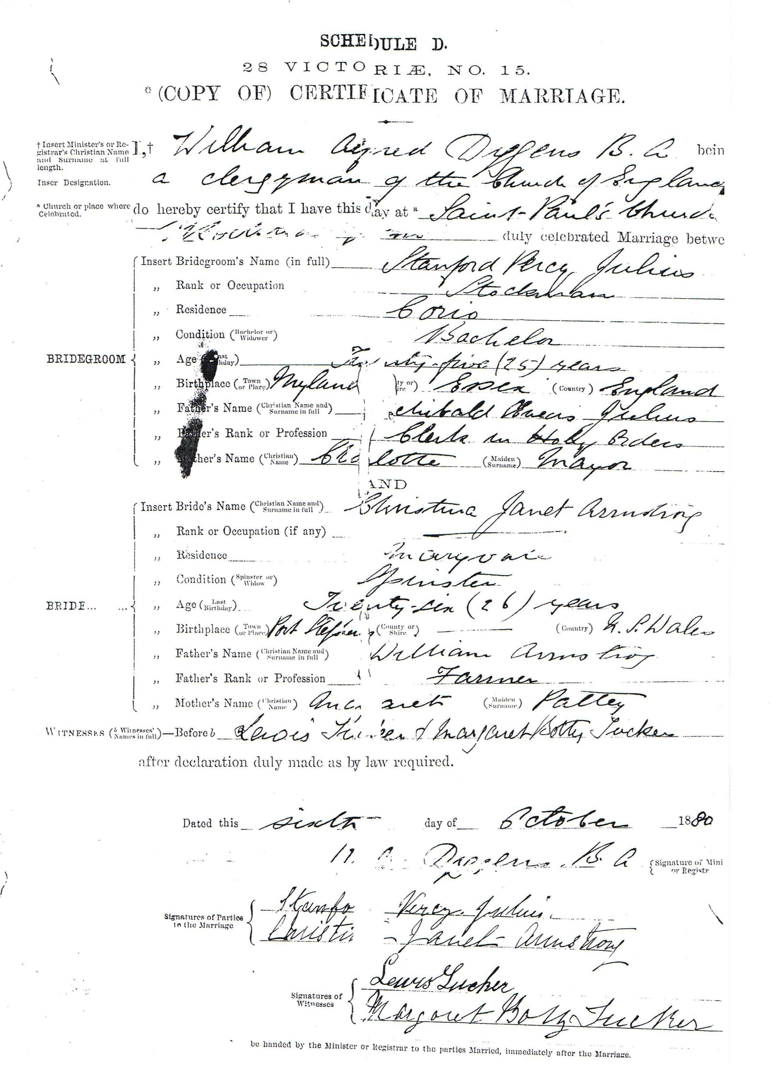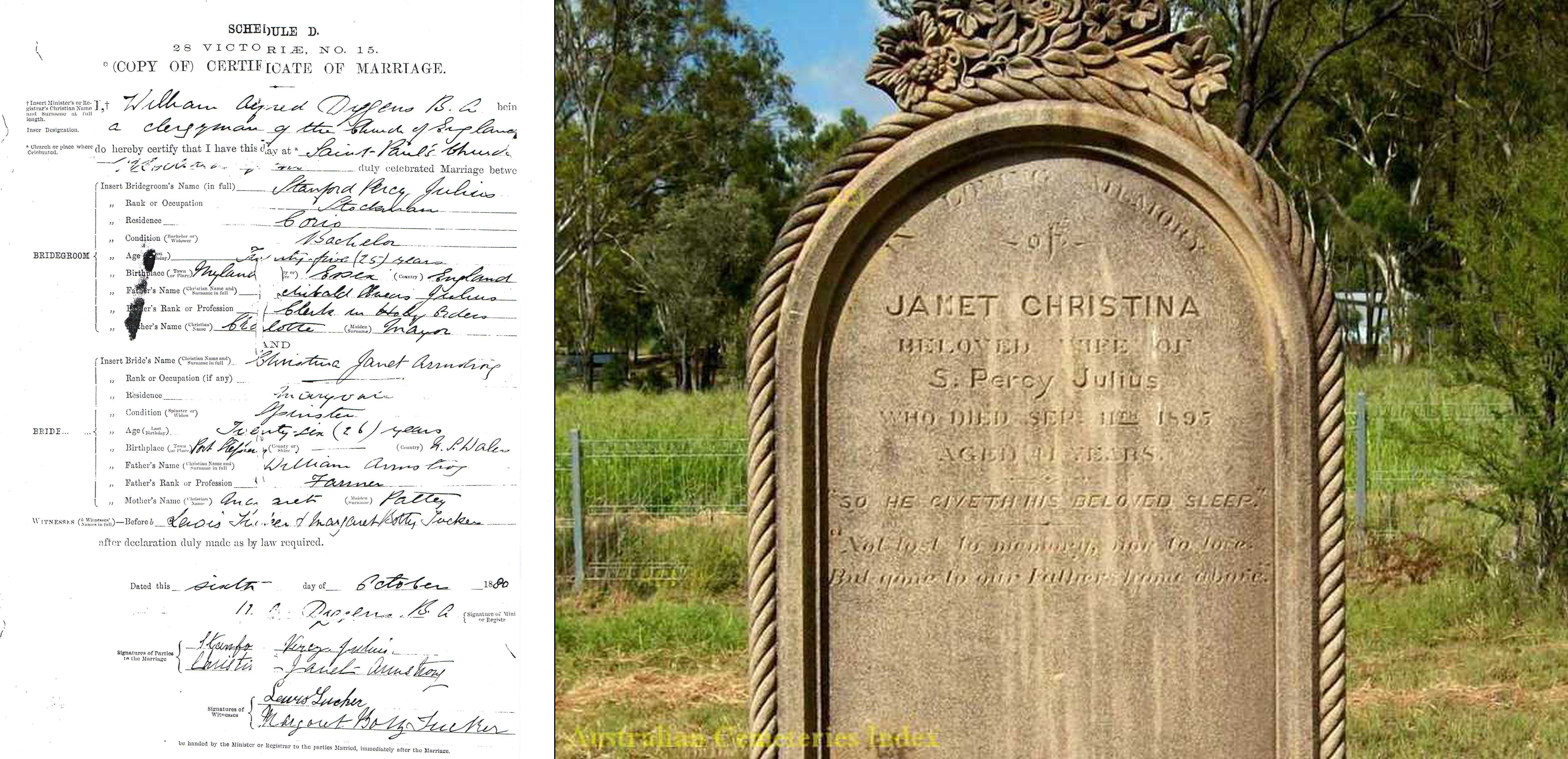 1. Janet Christina Armstrong. Janet married Stanford Percy JULIUS [898] [MRIN: 293], son of Rev Archibald Aeneas JULIUS [847] and Charlotte MAYOR [848], on 6 Oct 1880 in St Pauls Nth Rockhampton Qld. (Stanford Percy JULIUS [898] was born on 11 Nov 1854 in Myland Parish Mile End Rd Colchester ESS, died on 11 Sep 1929 in Gympie Queensland and was buried on 19 Sep 1929 in Gympie Cemetery.) |