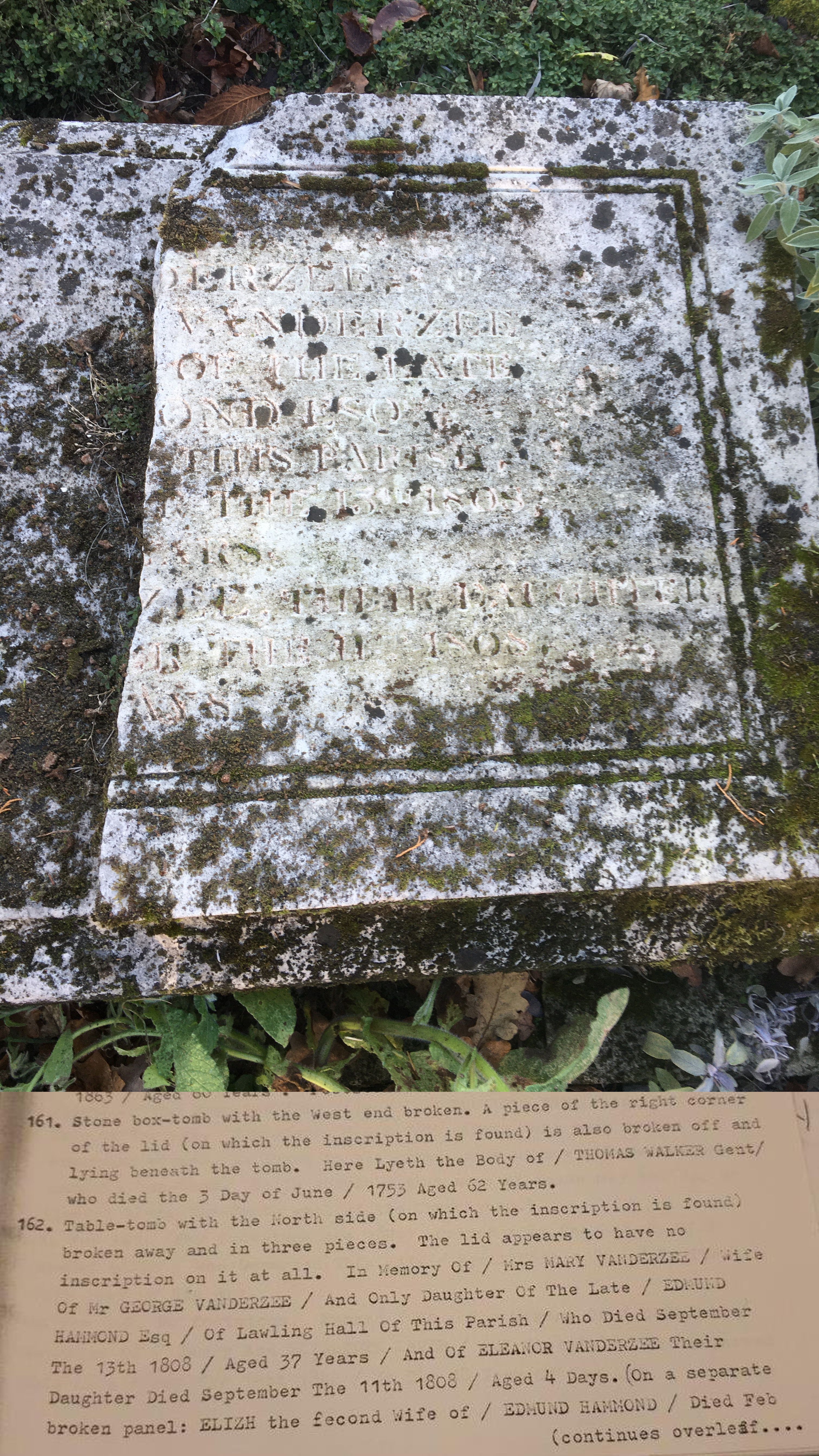 Record of Monumental Inscriptions from St Michael Latchingdon, Churchyard: 162 Table \endash tomb with the north side (on which the inscription is found) broken away and in three pieces. The lid appears to have no inscription on it at all. "In memory of / Mrs Mary Vanderzee / wife of Mr George Vanderzee / And only daughter of the late / Edmund Hammond Esq / Of Lawling Hall of this Parish / who died September 13, 1808 / Aged 37 years ? And of Elleanor Vanderzee their daughter ? Died September 11, 1808 / Aged four days."
