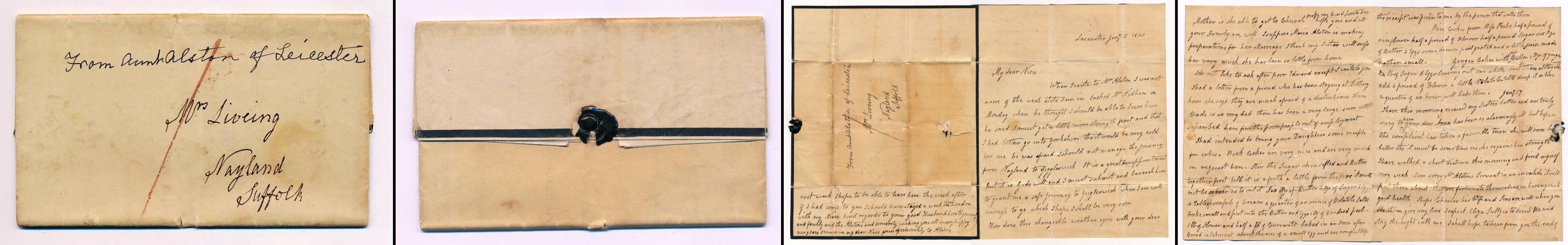 1. Catherine Alston nee Sultzer: Letter to Catherine Mary Liveing nee Downing, 15 Jan 1840, Leicester. Liveing Archive 43a-d LT4 Noted: From Aunt Alston of Leicester. (Catherine Sultzer) Written on 4 half sheets both sides of one piece of paper, one sheet edged in black and sealed with black sealing wax.