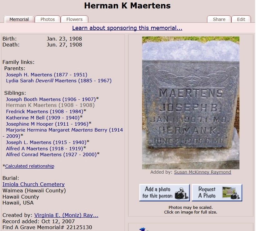 423. George Frederick GERAHTY [12869] (Digby Augustus Edward GERAHTY [1397]187, Augusta Louisa LOADER [1394]100, Lousia Caroline DARE [1389]72, Louisa Caroline JULIUS [771]43, William [685]16, William of Basseterre [687]6, William R N (Capt) [689]4, John of St Kitts West Indies [691]1) was born on 9 Apr 1895 in Queensland Aust. and died on 9 Apr 1895 in Queensland Aust.