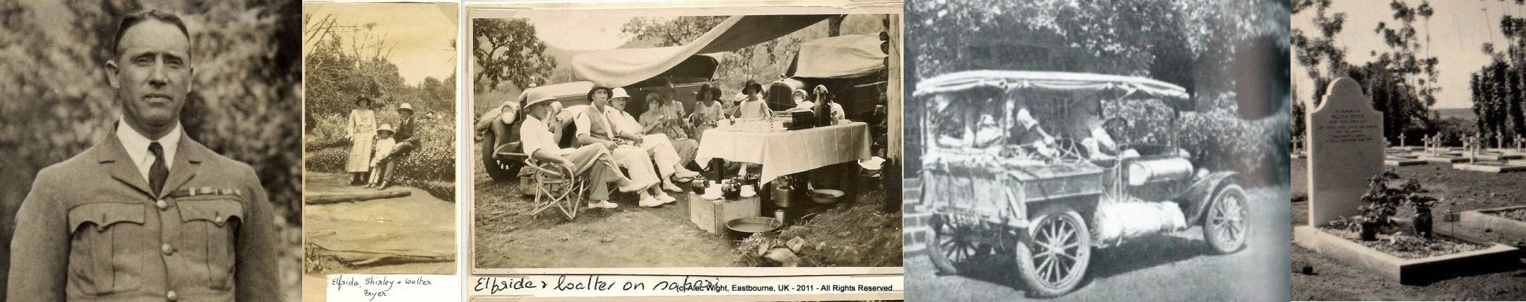 2. Walter Fryer: Images across time. Walter WWI, with Elfreda and daughter Shirley, on safari in Africa, Walters boxcar 1920's, Walters grave in Kisumu Kenya.