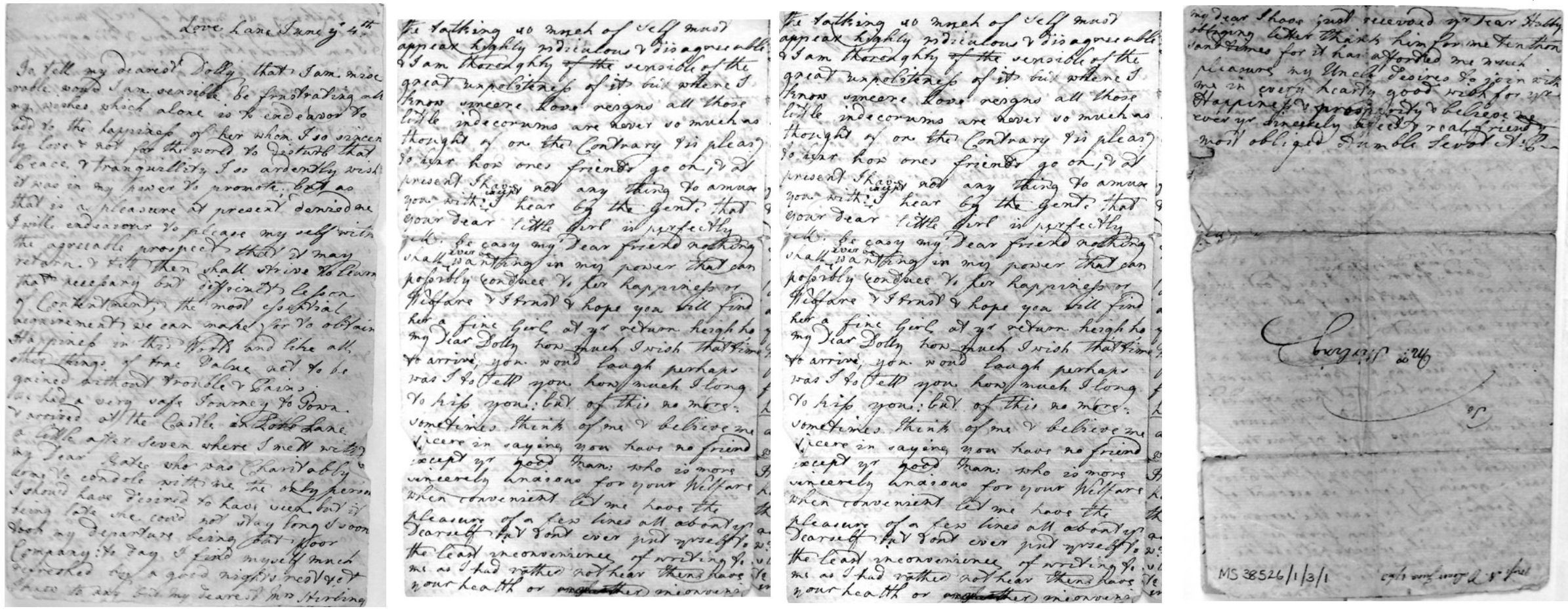 Wanlip Nov 18 1764 My dearest Dolly does not want many assurances on my part to convince her of the pleasure I experienced from the receipt of her two last obliging kind letters indeed my dear friend the hearing of your recovery after so long & severe an illness is a pleasure only to be felt not described & I sincerely hope you have by this time regained your Strenght & like me (who since I wrote last to you am) grown fat as a little Pig how rejoiced shou'd I be to see you so my dear upon your return to England; & how glad if that time was near; for I really long for a little unconfined chat with you such as we have often enjoyed in your Room at Love Lane; I have a thousand things to say but which are by no means worth communicating in this limited uncomfortable manner as wou'd you believe it I hate writing now as much as I once liked it & except your good self or my dearest Kate and a third Person as justly valuable to me I have dropped all my correspondents: - I receiv'd both your last letters dated June the 12th & August the 29th since my arrival at Wanlip, & if I have missed any opportunitys of writing I am very sorry as I well know the pleasure of hearing from those we love when so far separated & the pain of a disappointment of this sort; I heard from my Aunt a few days ago & a very good account of your dear little girl who she says grows very stout & hearty & is in perfect Health; I cannot say she is so forward in her Tongue as Misses commonly are; when I left Newington she cou'd only say 2 or 3 single words however her sex removes all doubts of her chattering fast enough by & by; I think she grows like Charles sweet dear boy how does he do; half a dozen kisses I beg you wou'd give him for me, I hope Watty has had no returns of his disorder & that your little one is well: who I flatter myself is likely to continue your youngest at least till we (Page 2) meet again, tell me my dear Dolly if my wishes are successful if not tis time enough to know when you can send me your additional news of the safe arrival of the stranger: I am extremely sorry to be so unfortunate not to have it in my power to shew that civility to Miss Greame I wish to do as an acquaintance & friend of yours; but my present situation renders it totally impossible, however you may depend on my taking the very first opportunity of seeing her when I go to London, which at present is uncertain whether it will be before Christmas or after, which also deprives me of the pleasure I shall always feel in having it in my power to render my dearest Mrs Stirling the least service by executing to the utmost of my abilitys any commissions she will favor me with, I have however wrote to our faithful Kate whose sincere attachment to you will make the employment very pleasing to her she wrote you a few lines in a letter I sent by Mr Ingles which I hope you have long ago received in which we gave you a long account of ourselves & our own concerns Subjects in general of little importance except to the writer & too contrary to the rules of Politeness to be defended upon any other principle, than that by which I woud ever wish to direct my conduct towards you my dear friend, whose kind professions of esteem has always been such as to convince me your affectionate heart is above all those little forms & that trifles if they concern the happiness of your friends become equally interesting to you as things of more material consequence does to the generallity of ones acquaintance: secure in this Opinion I propose giving you a long History of myself & my own transactions since I last did myself the pleasure of writing you which if I recollect right was the 1st of August the day (or rather the night) Kitty Lewis & I set out for this place, we had a very good Journey & was so happy to find my Father in perfect health (as thanks for your enquiry he now is) the House my dear Dolly you have often heard of and I hope have thereby formed an Idea as tho not in my power by description to give you one in this least degree equal to its (Page 3) appearance as tho in no one respect like any I have ever saw before; it was certainly in former days, one of the Fortified Castles belonging to the Ancient Baron's indeed we have it on record to have been built above 500 years but how much longer it may have stood is not known; the Situation is extremely pretty, tho entirely destitute of all neighbours except my Father's Tenants consisting of half a dozen Farmers Families who Inhabit the Village: at the distance of 5 or 6 miles round the Country however we visit under that denomination which indeed is perfectly in the style of my favorite Jenyns Country Visit "Where if you send three days before - The Squire who meets you at the door," "with Superfluity of breeding - First makes you sick & then with feeding" "then Whirled over hillocks ruts & stones, - Enough to dislocate ones bones " we, home, return, a wondrous token, - Of Heavens kind care, with limbs unbroken: however most of our time has been spent in the more satisfactory enjoyments of friendly conversation amongst ourselves, with the kindly assistance of reading writing & work; with which we have always so divided the day as never to find it too long for our amusements but on the contrary frequently complain for the want of leisure notwithstanding tis now above three weeks since we have stirred beyond the limits of the garden, or seen a Soul but ourselves: different as this recluse way of life is from what I have ever been accustomed tis perfectly suited to my taste & cou'd I have the happiness of now & then seeing a few dear friends the Town has but small charms to make me wish ever to revisit it. My dearest Mr: W: paid us a visit for a few days is very well tho' far from happy as his Father continues to deny his consent notwithstanding he knows of our keeping up the same connection & intercourse as ever & his Sons determination never to give it up; & so my dear you see I am likely to remain Miss for t