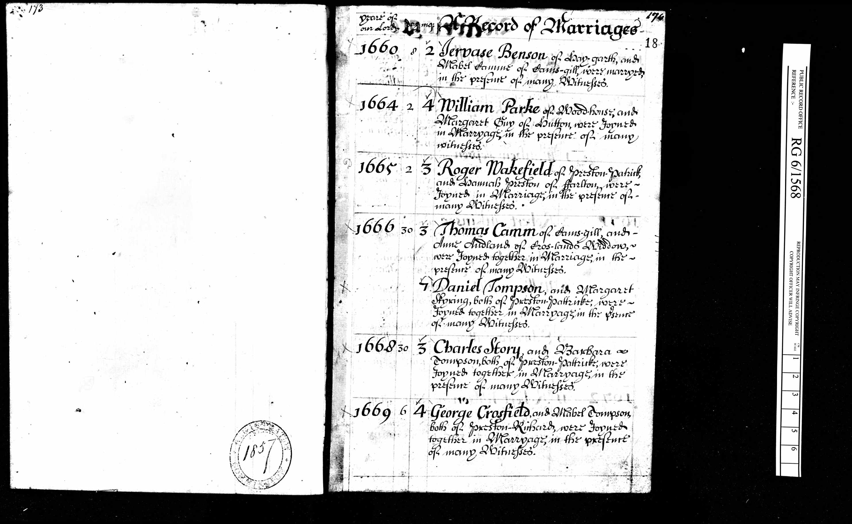 Hannah married Roger WAKEFIELD [12170] [MRIN: 4079], son of Nicholas WAKEFIELD [34776] and Elizabeth GREENEWOOD [34777], on 21 Mar 1664/65 in Kendal Meeting House (Quaker) of Farleton Westmoreland. (Roger WAKEFIELD [12170] was born in 1636 in Preston Patrick WES and died in 1724 in Challon Hall Preston Patrick WES England.) |