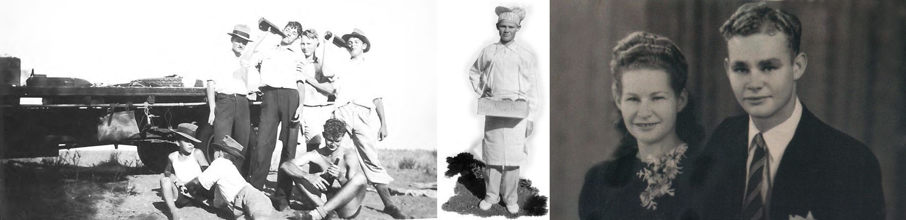 At the age of twelve I was in the Cloncurry hospital for three months with rheumatic fever. It affects your heart. It leaves it with a murmur and it's weakened. When I came out of hospital I had to keep away from sports. I wasn't to get excited, that was the thing. Around that time a new head teacher arrived, Arthur Cann, and he was a horrible old turd. I was halfway through fifth grade, just back from hospital, and this old bugger used to belt hell out of me because I couldn't get the grip of learning. It wasn't long before I left school, although I did go back for two weeks when the education train came out. One carriage was for the girls and one for the boys. The girls learnt dressmaking and cooking; the boys learnt tin smithing, woodwork, how to make chairs, and things like that. The two carriages parked on a side line just down a bit from our house. I went to it twice - the second time only because I liked woodwork. I'm pretty sure I'd left school by then, at grade 6. My first job was with Bert Pollard. He was the undertaker and I was going to do an apprenticeship with him as a builder of coffins. Oh, he had the foulest mouth going, and his girls were just as foul mouthed. He used to talk with them any old how. He says to me one time there: "Go and find that fuckin spanner. I told you not to lose the bastard." And I told him: "Look, I've had enough of you. I don't have to put up with your swearing. I'm not one of your kids you're talkin to now." And I left and got a job at Jaques butcher shop. Charlie Byrne had a butcher shop in the main street and George Jaques had the other one in the front street. At the time I was getting 15/6 a week. All my other mates from school were in the shearing sheds getting two and three pound a week and their keep. So I said goodbye to the butcher trade and went out to the sheds. And from there I joined up. I was down at Gabba camp in Brisbane when they told me: "You're out". They gave me a little slip of paper saying: "Temporarily medically discharged" owing to heart whatever-it-was. That was on the 24th March, 1942. 1 remember Clive and his mate saying: "Look at this lucky bugger; he's been kicked out of the army because he's temporarily medically insane". I came back from Brisbane and I went into the shearing sheds again. I wasn't out there long; the heat got too much for me. I came to Townsville and got tangled up with the Americans, their Fifth Airforce. I was attached to them during the war. It was in Townsville I met my wife and we got married in '46. I've been back to Julia Creek several times since, but never to live. I liked the freedom we had as children in Julia Creek. You played here, you played there, you weren't frightened, you could go out and leave the house unlocked; you could come and go as you were able to - or let. Different nights we'd be at our place or at the Winton's, singing songs around the piana. On moon-lit nights we'd get out and play Crows & Cranes, Drop the Hanky or Red Red Rover. With Crows & Cranes there were two rows of children and there'd be one child calling. She'd sing our 'Crrrro. . . . . ', then change it to Cranes'. The Crows ran off and the Cranes had to catch them. We had good times playing those simple games; and we had good times at the fancy dress balls, too. Mrs Petersen organised them. She had this Grand March and she'd parade us round-n-round in Eckford's Hall. That's Clive, he went as a swagman. In the background you can see a miniature wagon. Another brother, Herbie, he used to yoke that wagon to the goats. He had all the team stuff, the bridles and yoking gear, and he'd go over to the railway with a team of four goats and cart cinders around town. Herbie went to old man Tracey, he had a store: Do you want any cinders Mr Tracey? Yes, Herbie, how much a load? Herbie told him so-much. How many loads you want, Mr Tracey? Oh, you keep bringing them and I'll let you know, But there must have been some misunderstanding because Herbie loaded up every bit of cinder he delivered and brought it home and spread it around our place. I was in the Grand March as a baker boy one year, carrying a tray full of little buns and wearing an outfit with 'Baker' on it and Eat More Bread'. Bally Kaeser made the buns and the other kids were stealing them off me. I wasn't selling them; the mickie loaves were just advertising his bread. Mickies were a little bread roll, If Bally had dough left over he'd make balls out of it and put them in the oven, All us kids'd go to the bakery after school: "Ya got any mickies today, Bally?" and he'd hand them out.