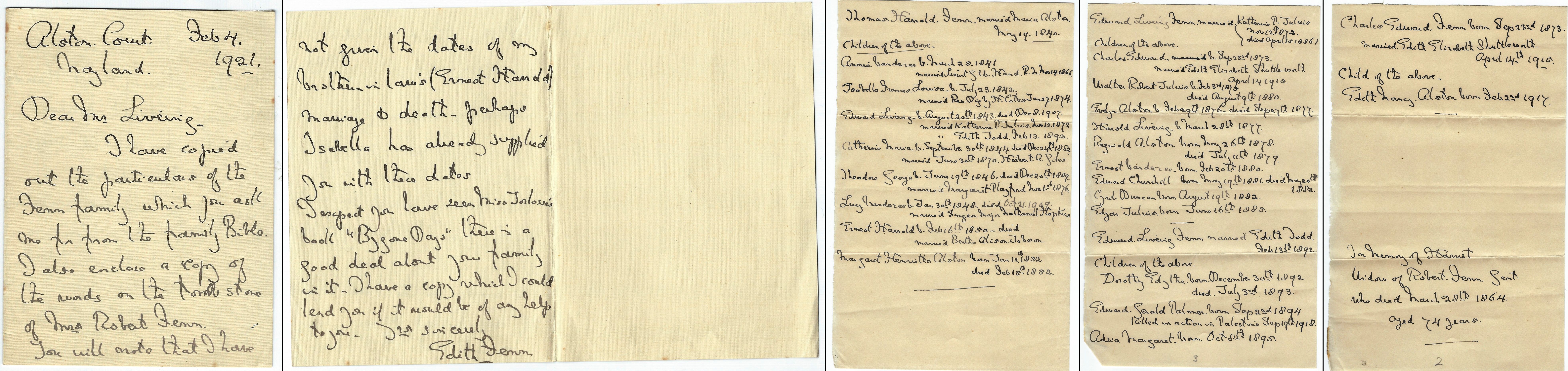 Dear Mr Liveing, I have copied out the particulars of the Fenn family which you ask me for from the family Bible I also enclose a copy of the words on the tombstone of Mrs Robert Fenn. You will note that I have Page 2 not given the dates of my brother in law's (Ernest Harrold) marriage & death \endash perhaps Isabella has already supplied you with these dates. I expect you have seen Mr Torlesse's book "Bygone Days" there is a good deal about your family in it stop I have a copy which I could lend you if it would be of any help to you. Yours sincerely, Edith Fenn.