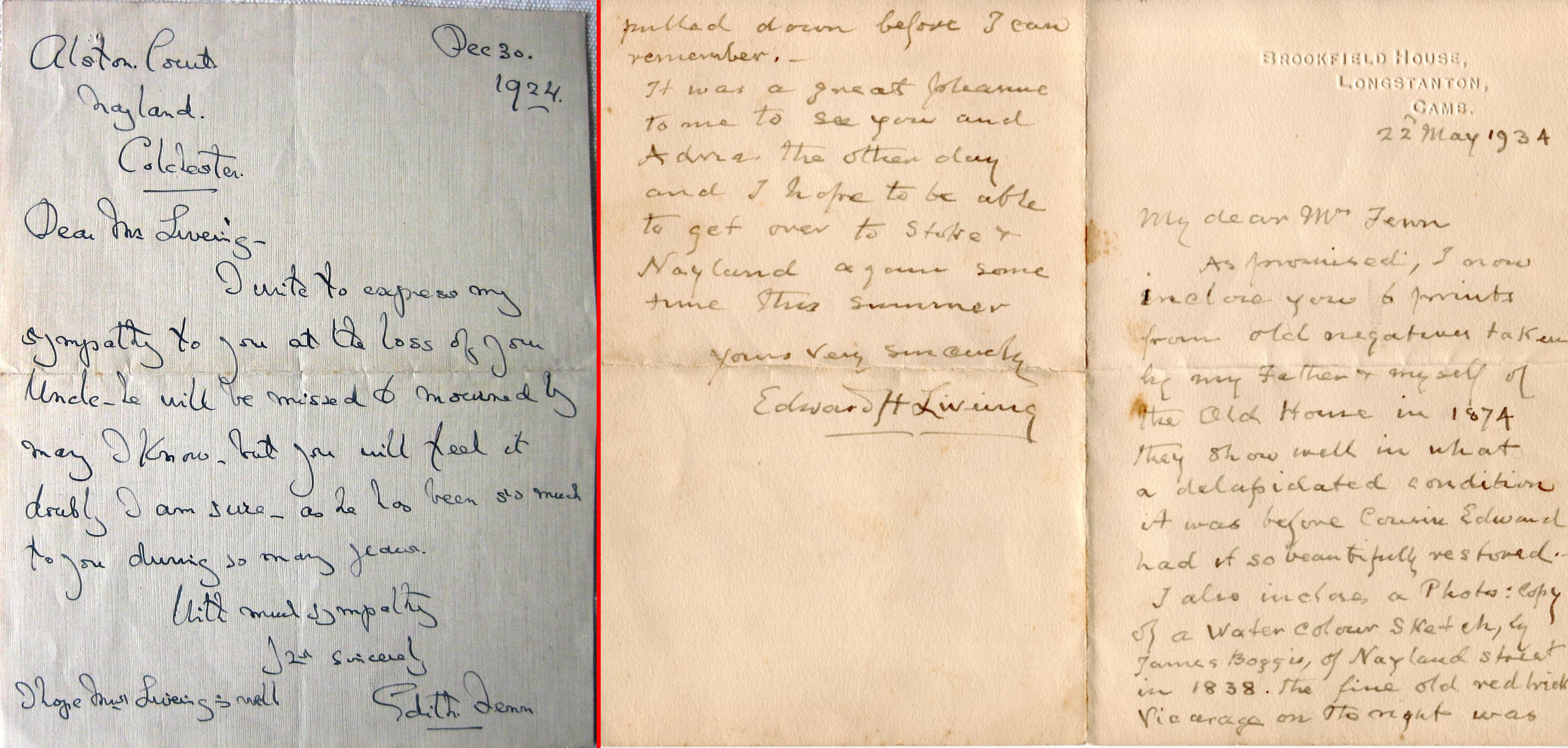 Brookfield House Longstanton Cambridgeshire 22 May 1934 My dear Mrs Fenn As promised I now enclose you six prints from old negatives taken by my father and myself of the old house in 1874, they show well in what a dilapidated condition it was before cousin Edward had it so beautifully restored. I also enclose a photo copy of a watercolour sketch by James Boggis of Nayland Street in 1838 the fine old redbrick vicarage on the right was pulled down before I can remember. It was a great pleasure to me to see you and Adria the other day and I hope to be able to get over to Stoke and Nayland again sometime this summer. Yours very sincerely Edward H. Liveing Letter without envelope on file E L Fenn 2007.