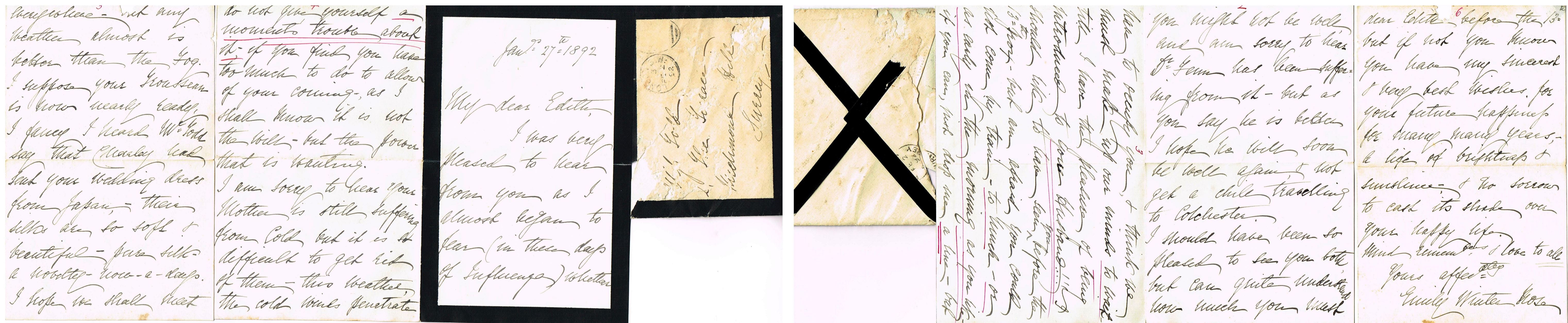 5. Edith Todd, 27 Jan 1892. My dear Edith I was very pleased to hear from you as I almost began to fear (in these days of influenza) whether you might not be well, and am sorry to hear Dr Fenn has been suffering from it \endash but as you say he is better I hope he will soon be well again, and not get a chill travelling to Colchester. This I should have been so pleased to see you both but can quite understand how much your . . . . . Page 3 having to occupy you, and think we must make up our mind to wait till I have the pleasure of being introduced to your husband !!! I should like to have seen seen you before the 13th Feb [?] - But am afraid you could not come by train \endash two lunch \endash or as early as the morning as you like if you can, fish [?] Drop me a line \endash but do not give yourself a moments trouble about it \endash if you find you have too much to do to allow of your coming \endash as I shall know it is not the will \endash but the power that is wanting. I am sorry to hear your mother is still suffering from cold but it is so difficult to get rid of them \endash this whether the cold winds penetrate everywhere [?] \endash But any whether almost is better than the fog. I suppose your trousseau is now nearly ready, I fancy I heard Mr Todd say that Charlie had sent your wedding dress from Japan \endash their silks are so soft and beautiful \endash pure silk a scarcity nowadays. I hope we shall meet dear Edith before the 30 but if not you know you have my sincerest and very best wishes for your future happiness for many many years. A life of brightness and sunshine \endash and no sorrow to cast its shadow over your happy life. . . . . . . . . . . and love to all Yours affectionately Emily Winter Mosey [?]
