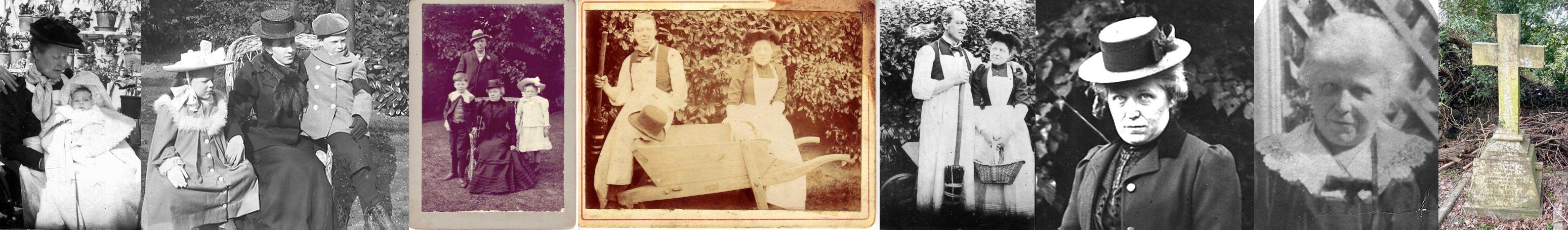 6. Edith Clara: With her family, Cir 1900. Two images of Edward & Edith "playing at being the gardners", Edith in later life, her grave in the Nayland Burial Ground. Image of grave courtesy Ed Hutchings - 2021