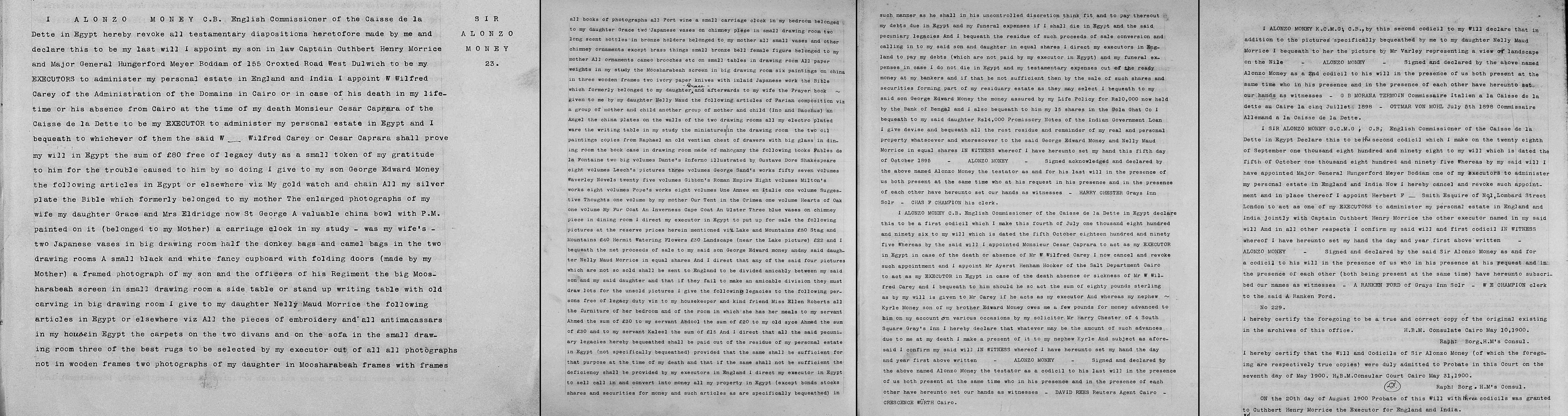 1. Alonzo Money: Will, 5 Oct 1895 plus two Codicils. I AL0NZ0 M0NEY C.B. English Commissioner of the Caisse de la Dette1 in Egypt hereby revoke all testamentary dispositions heretofore made by me and declare this to be my last will I appoint my son in law Captain Cuthbert Henry Morrice and Major General Hungerford Meyer Boddam of 155 Croxted Road West Dulwich to be my EXECUTORS to administer my personal estate in England and India I appoint W Wilfred Carey of the Administration of the Domains in Cairo or in case of his death in my lifetime or his absence from Cairo at the time of my death Monsieur Cesar Caprara of the Caisse de la Dette to be my EXECUTOR to administer my personal estate in Egypt and I bequeath to whichever of them the said W Wilfred Carey or Cesar Caprara shall prove my will in Egypt the sum of £80 free of legacy duty as a small token of my gratitude to him for the trouble caused to him by so doing I give to my son George Edward Money the following articles in Egypt or elsewhere viz My gold watch and chain All my silver plate the Bible which formerly belonged to my mother The enlarged photographs of my wife my daughter Grace and Mrs Eldridge now St George A valuable china bowl with P.M. painted on it (belonged to my Mother) a carriage clock in my study - was my wife's - two Japanese vases in big drawing room half the donkey bags and camel bags in the two drawing rooms A small black and white fancy cupboard with folding doors (made by my Mother) a framed photograph of my son and the officers of his Regiment the big Moosharabeah screen in small drawing room a side table or stand up writing table with old carving in big drawing room I give to my daughter Nelly Maud Morrice the following articles in Egypt or elsewhere viz All the pieces of embroidery and all antimacassars in my house in Egypt the carpets on the two divans and on the sofa in the small drawing room three of the best rugs to be selected by my executor out of all all photographs not in wooden frames two photographs of my daughter in Moosharabeah frames with frames all books of photographs all Port wine a small carriage clock in my bedroom belonged to my daughter Grace two Japanese vases on chimney piece in small drawing room two long scent bottles in bronze holders belonged to my mother all small vases and other chimney ornaments except brass things small bronze bell female figure belonged to my mother All ornaments cameo brooches etc on small tables in drawing room All paper weights in my study the Moosharabeah screen in big drawing room six paintings on china in three wooden frames two ivory paper knives with inlaid Japanese work the Bible which formerly belonged to my daughter Grace and afterwards to my wife the Prayer book given to me by my daughter Nelly Maud the following articles of Parian composition viz a group of mother and child another group of mother and child (Ino and Bacchus) an Angel the china plates on the walls of the two drawing rooms all my electro plated ware the writing table in my study the miniatures in the drawing room the two oil paintings copies from Raphael an old ventian chest of drawers with big glass in dining room the book case in drawing room made of .mahogany the following books Fables de la Fontaine two big volumes Dante's Inferno illustrated by. Gustave Dore Shakespeare eight volumes Leech's pictures three volumes George Sand's works fifty seven volumes Waverley Novels twenty five volumes Gibbon's Roman Empire Eight volumes Milton's works eight volumes Pope's works eight volumes Une Annee en Italie one volume Suggestive Thoughts one volume by my mother Our Tent in the Crimea one volume Hearts of Oak one volume My Fur Coat An Inverness Cape Coat An Ulster Three blue vases on chimney piece in dining room I direct my executor in Egypt to put up for sale the following pictures at the reserve prices herein mentioned viz Lake and Mountains £50 Stag and Mountains £40 Hermit Watering Flowers £30 Landscape (near the Lake picture) £22 and I bequeath the net proceeds of sale to my said son George Edward Money and my said daughter Nelly Maud Morrice in equal shares And I direct that any of the said four pictures which are not so sold shall be sent to England to be divided amicably between my said son and my said daughter and that if they fail to make an amicable division they must draw lots for the unsold pictures I give the following legacies to the following persons free of legacy duty viz to my housekeeper and kind friend Miss Ellen Roberts all the furniture of her bedroom and of the room in which she has her meals to my servant Ahmed the sum of £30 to my servant Abdool the sum of £20 to my old syce Ahmed the sum of £30 and to my servant Kaleel the sum of £15 And I direct that all the said pecuniary legacies hereby bequeathed shall be paid out of the residue of my personal estate in Egypt (not specifically bequeathed) provided that the same shall be sufficient for that purpose at the time of my death and that if the same shall not be sufficient the deficiency shall be provided by my executors in England I direct my executor in Egypt to sell call in and convert into money all my property in Egypt (except bonds stocks shares and securities for money and such articles as are specifically bequeathed) in such manner as he shall in his uncontrolled discretion think, fit, and to pay thereout my debts due in Egypt and my funeral expenses if I shall die in Egypt and the said pecuniary legacies And I bequeath the residue of such proceeds of sale conversion and calling in to my said son and daughter in equal shares I direct my executors in England to pay my debts (which are not paid by my executor in Egypt) and my funeral expenses in case I do not die in Egypt and my testamentary expenses out of the ready money at my bankers and if that be not sufficient then by the sale of such shares and securities forming part of my residuary estate as they may select I bequeath to my said son George 