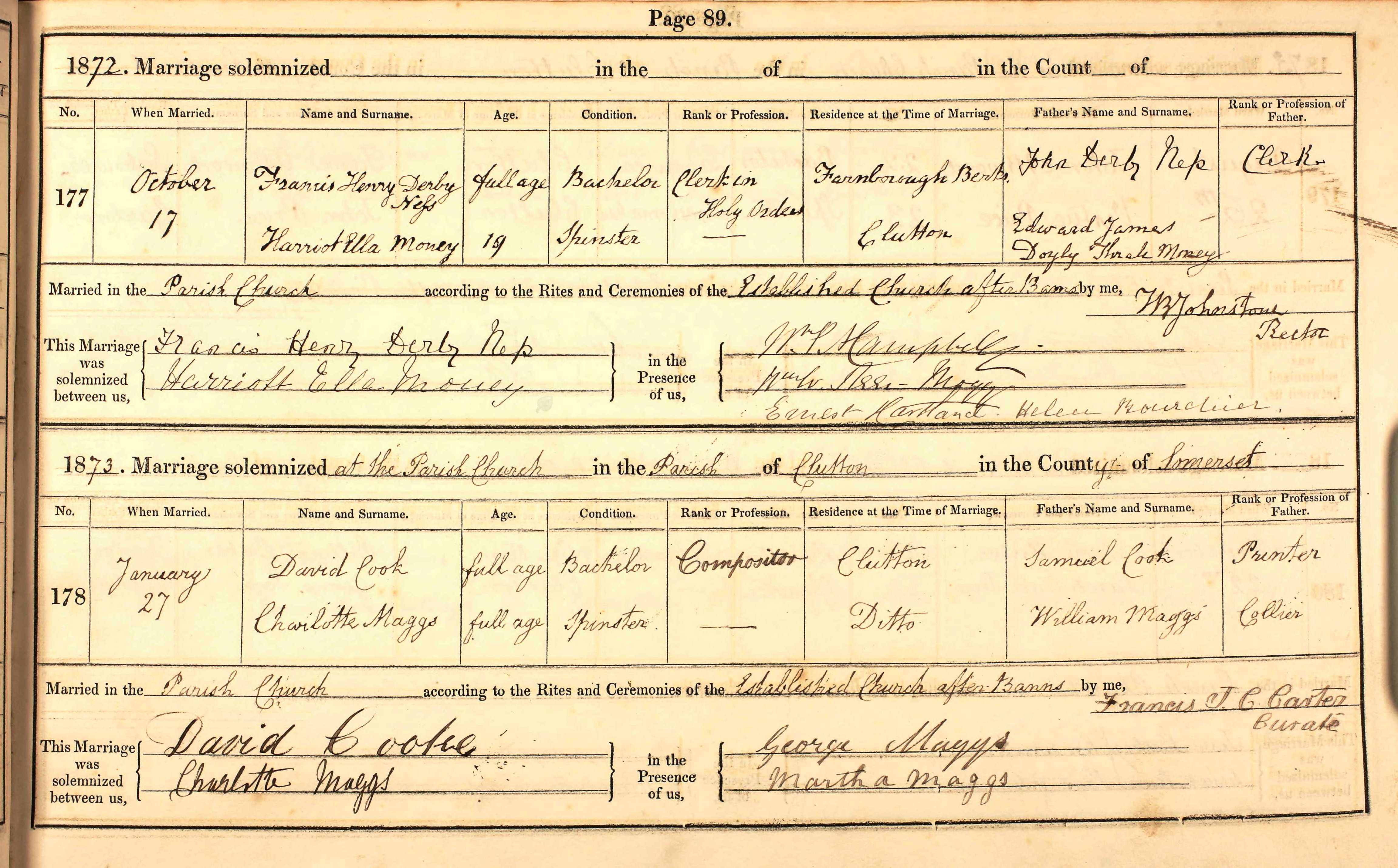 Harriot married Rev Francis Henry Derby NESS [28110] [MRIN: 9947], son of Rev John Derby NESS [28111] and Unknown, on 17 Oct 1872 in Clutton SOM. |
