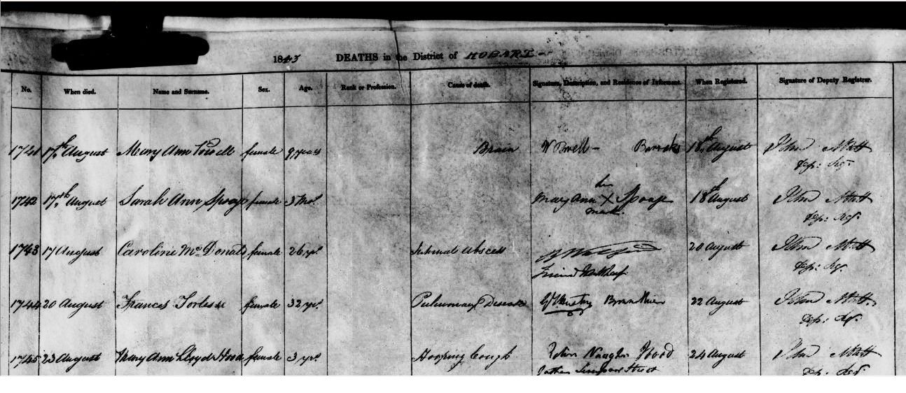 Frances married Lieut Henry Boden TORLESSE R N [1622] [MRIN: 111], son of John TORLESSE [1627] and Anna Maria ROBINSON [1628], on 28 Jun 1829 in Elizabeth Town (New Norfolk) Tasmania Aust. (Lieut Henry Boden TORLESSE R N [1622] was born on 19 Jun 1793, died on 24 Oct 1843 in Tasmania Aust. and was buried in Kingston, Browns River Churchyard..). The cause of his death was cancer. |
