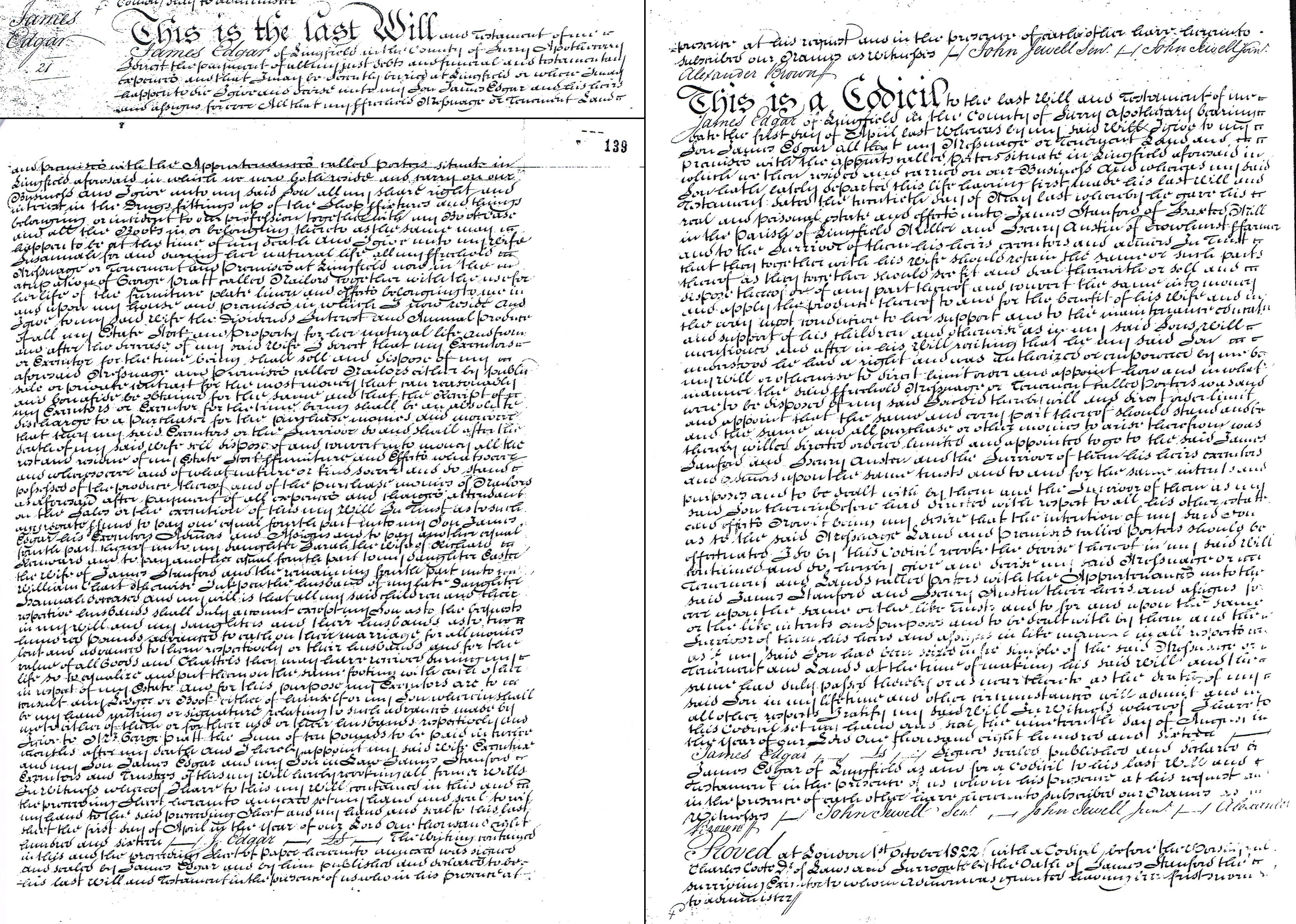 The Codicil, dated 19 August 1816, recites that his s. James Edgar has died (see his will Add MSS no. 17547) and provides that the messuage called Porters shall be disposed of according to the directions in the will of s. James Edgar Witnesses: John Jewell, sen., John Jewell, jun., Alexander Brown