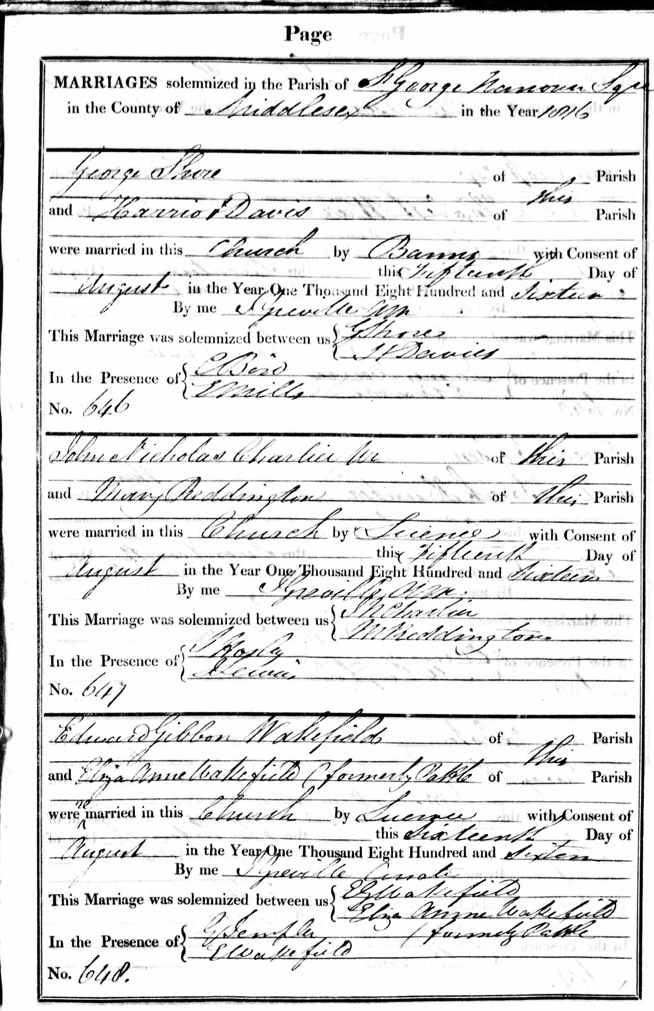 1. Wakefield to Pattle: Marriage, 16 Aug 1816, St George Hanover Sq. Eliza married Edward Gibbon WAKEFIELD [1655] [MRIN: 544], son of Edward WAKEFIELD [1637] and Susannah CRUSH [1638], on 27 Jul 1816 in Edinburgh SCT. (Edward Gibbon WAKEFIELD [1655] was born on 20 Mar 1796 in Old Jewry City of London, died on 16 May 1862 in Wellington NZ and was buried in Bolton St Cemetery Wellington.) |