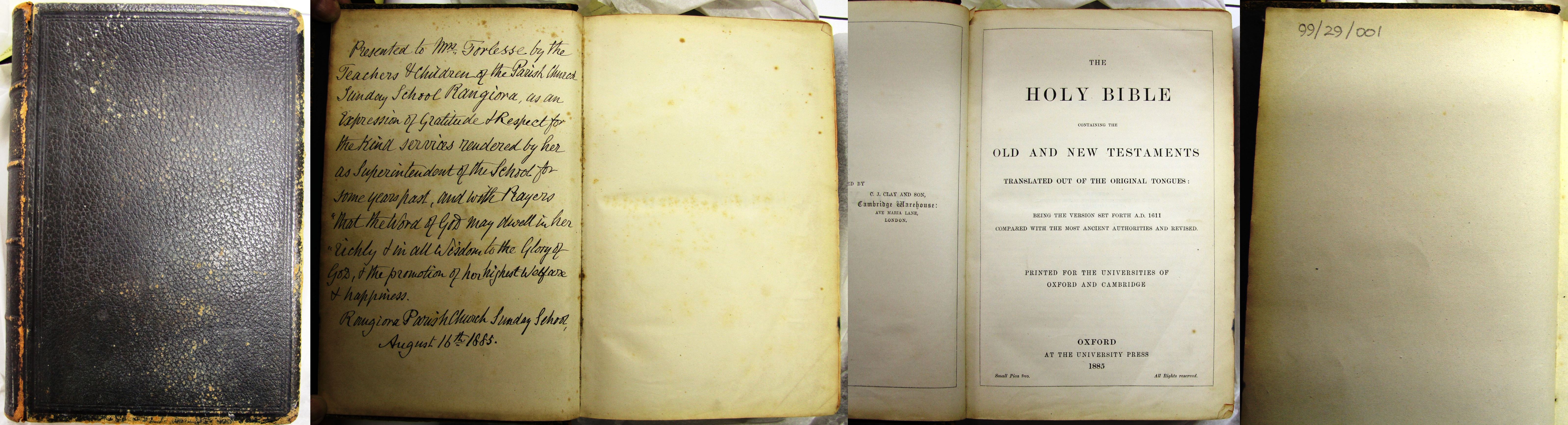 1. Lizzie Revell: Bible given her 1885, by the Rangiora Parish Sunday School children & parents. Images of Eliza's bible courtesy of Rangiora Museum 2012.