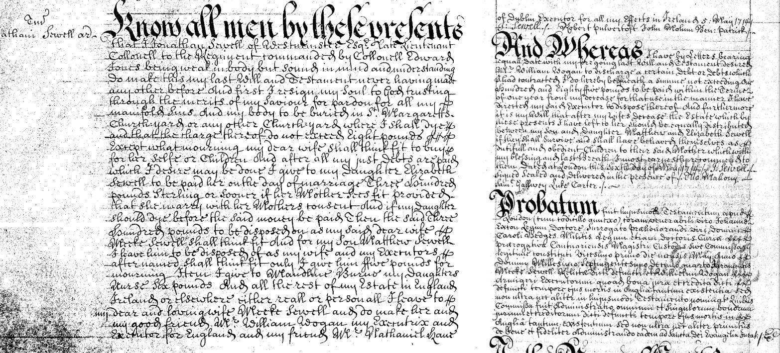 PROB 11/540/136 Description: Will of Jonathan Sewell, dated 5 May 1714 late Lieutenant Colonel to the Regiment Commanded by Colonel Edward Jones of Westminster, Middlesex. On this file to be transcribed Date: 21 May 1714 Held by: The National Archives, Kew Legal status: Public Record