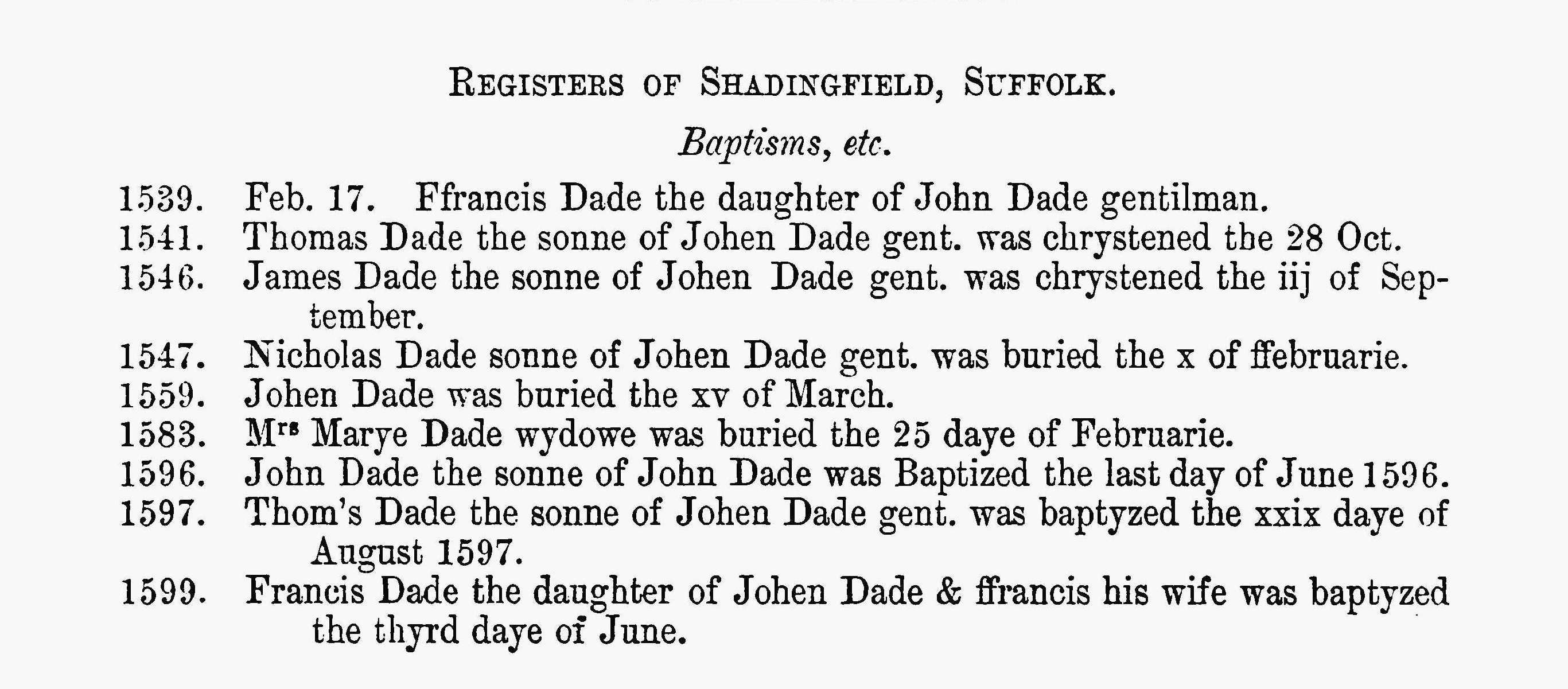 Mary married John DADE of Shaddingfield SFK [32163] [MRIN: 11450], son of John DADE [31939] and Margaret PAKENHAM [32160]. (John DADE of Shaddingfield SFK [32163] was born in 1526 in Witton NFK, died in 1559 in Shadingfield SFK and was buried on 15 Mar 1559 in Shadingfield SFK.) |