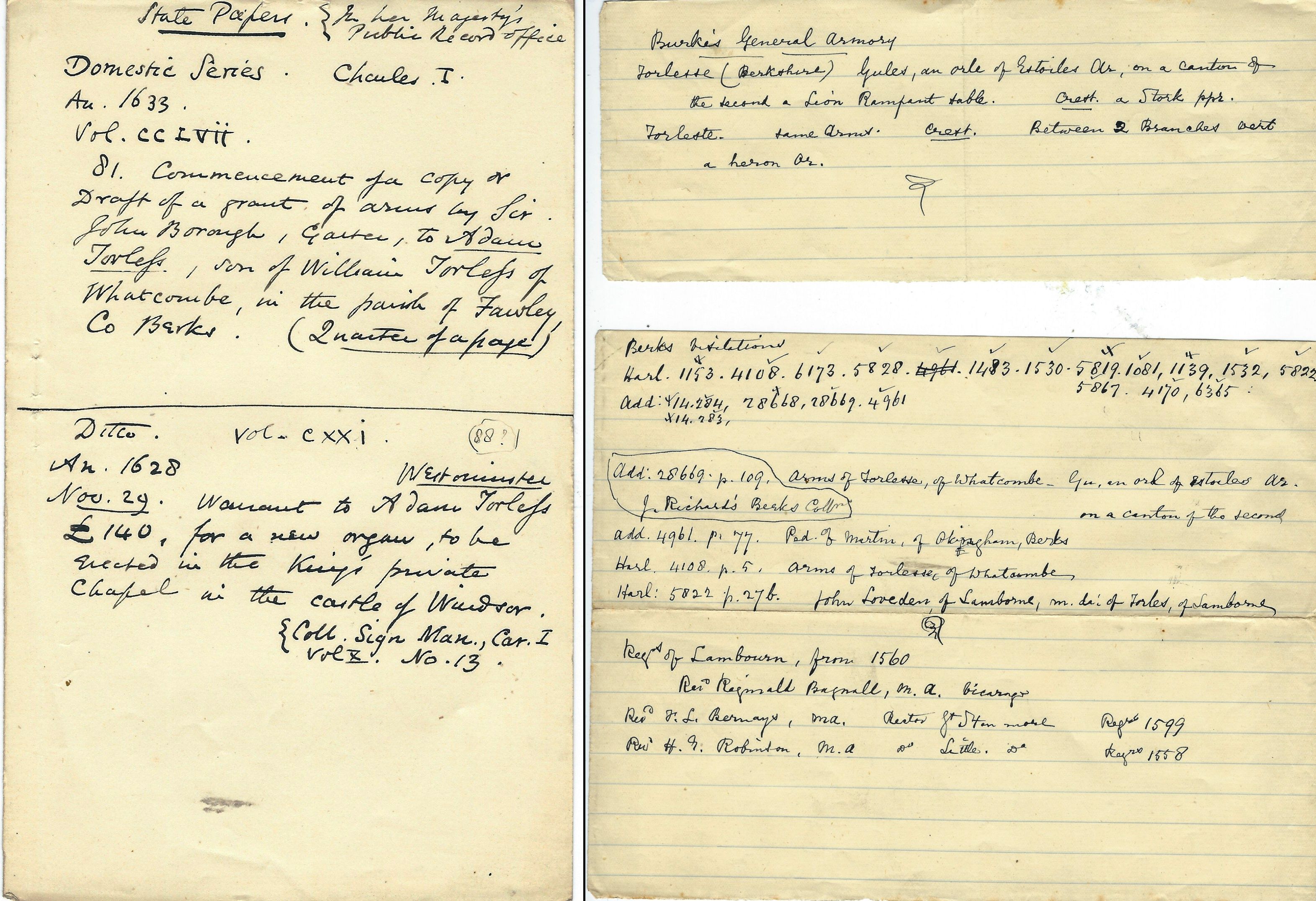 Freeman, quoting the State Papers, Domestic, Coll. Sign Man. Car. 1, Vol. 10, no. 13, Provides the documentation (29 November 1628) for the construction of this instrument: Charles R Charles by the grace of God &c. To the Treasurer and Undertreasurer of the Exchequer for the time being. greeting. Whereas we have given order for the making of a new organ to be set up in the (Kings) private chapel in our Castle at Windsor. the charge whereof will amount to the sum of one hundred and forty pounds. we will and command you of our treasure in the receipt of our Exchequer forthwith to pay or cause to be paid unto Adam Torlesse. Gentleman, or his assigns, the said sum of one hundred and forty pounds of lawful money of England to be employed for the service aforesaid and without account impressed or other charge to be set upon him, his heirs. or assigns for the same or for any part or panel thereof, and these. &c. given, R. W. Rimbault read the name Fortess, it is indexed in the State Papers as Torlesse, and Freeman gives it as Fortress in MT 51 (1910): 379: obviously the script is hard to decipher, and to the best of my knowledge the name does not appear in any other document.