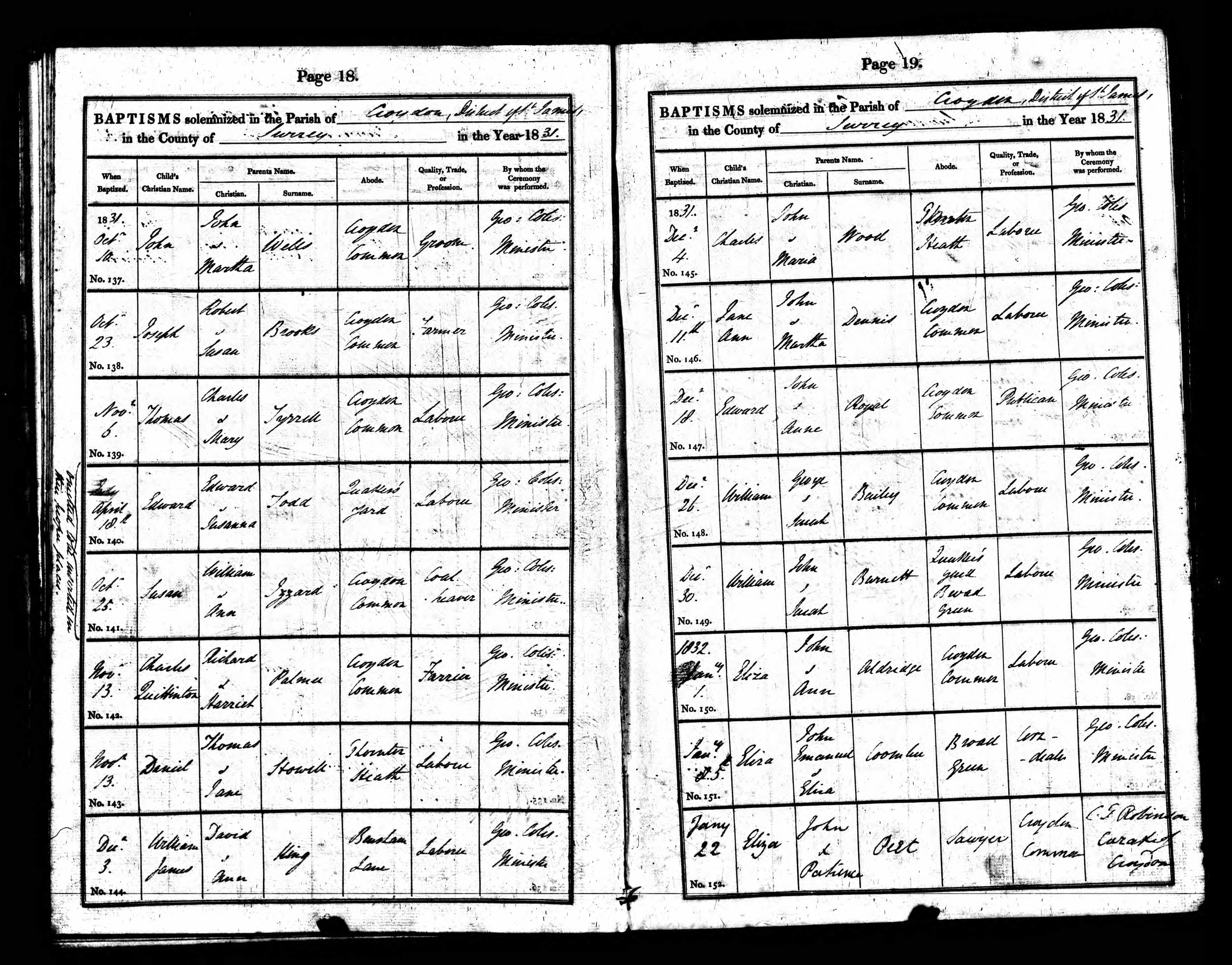 1. Census: England, 2 Apr 1871, District 42 Croydon SRY. William is recorded as head of house married aged 36 an Ag Lab. born Croydon SRY 2. Census: England, 3 Apr 1881, 10 Parchmore Tce Croydon SRY. William is recorded as head of house married aged 40 a labourer born Croydon 3. Census: England, 5 Apr 1891, 102 Bensham Groove Upper Norwood Croydon. William is recorded as head of house married aged 55 an agricultural labourer born Croydon. 4. Census: England, 31 Mar 1901, 48 Cranbrook Rd Croydon SRY. William is recorded a head of house married aged 69 a jobbing gardner born Croydon William married Eliza DYKE [21080] [MRIN: 7509], daughter of Aaron DYKE [21086] and Elizabeth Marie WILSON [21087], on 30 Sep 1866 in St John Croydon SRY. (Eliza DYKE [21080] was born on 15 Oct 1837 in Sydenham KEN, baptised on 15 Oct 1837 in St Bartholomew Sydenham Kent and was buried on 20 Dec 1916 in Croydon Cemetery Croydon.) |